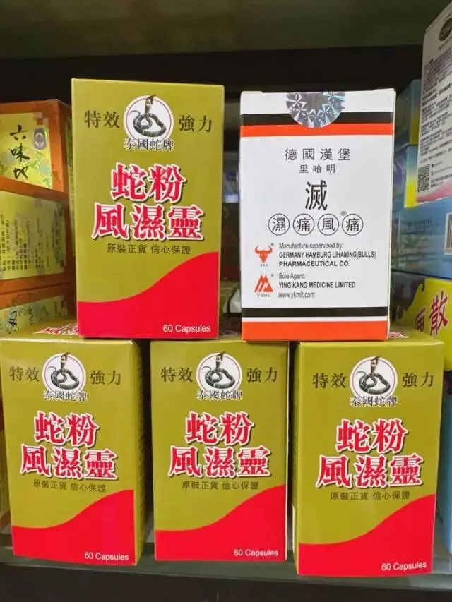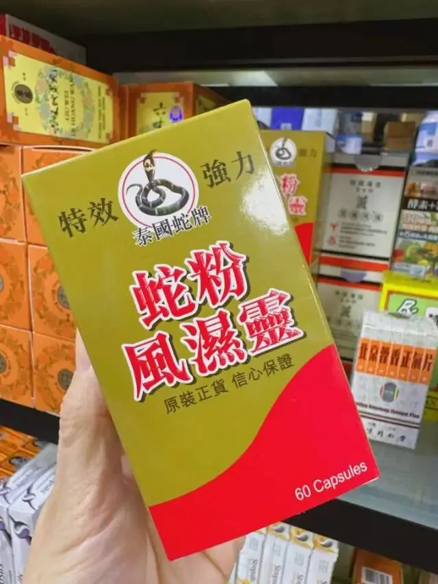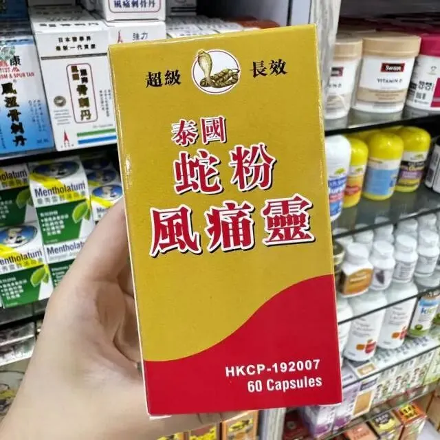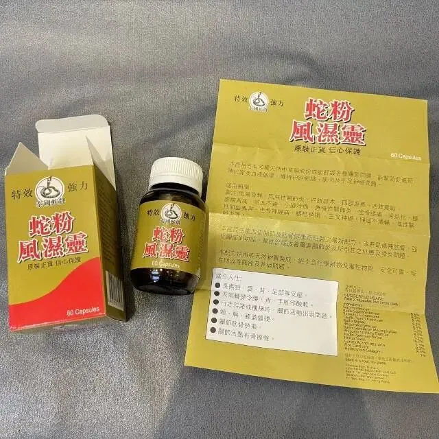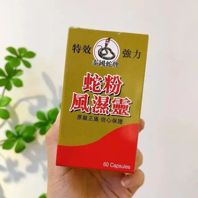 泰国蛇牌蛇粉风痛灵60粒适应:风湿性关节炎、肩周炎、骨刺、痛风、神经痛、急性慢性关节炎、坐骨神经痛、颈椎炎、肌肉痛、腰间椎盘凸出、骨质增生、运动后劳损及麻痹,改善关节活动能力,经临床实验证明,不损肝脏及胃,男女老少均可服用,每日二次,每次两粒。