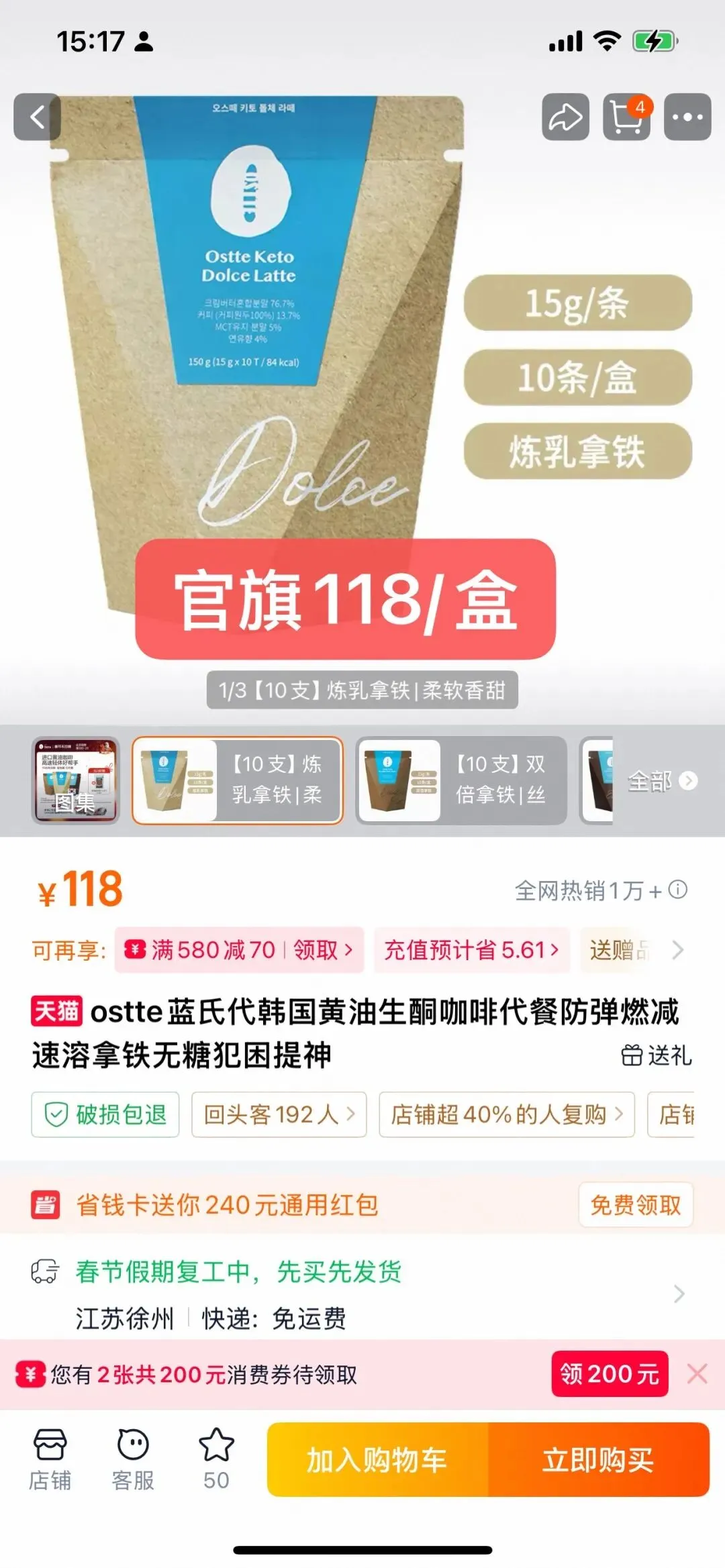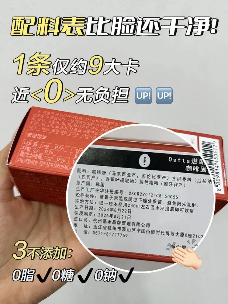 基础信息: Ostte(蓝氏代)咖啡合集 【品名1】Ostte能量燃脂咖啡(黄油生酮咖啡) 【规格】15g*10条/盒,84kcal/86kcal/85kcal 【口味】炼乳拿铁、双倍拿铁、浓缩黑拿铁 【生产日期】2026年1月 【保质期】24个月 【食用建议】冷热水均可,热水最佳,每天至少代一餐,一个月喝3盒为一个减脂周期 【功效】健康减肥、高效燃脂、饱腹代餐、补充能量和营养、提高精力和身体机能、滋养皮肤、消除便秘 【品名2】Ostte燃断1000黑美式咖啡 【规格】2.5g*10条/盒,9Kcal/条 【生产日期】2025年12月 【保质期】24个月 【食用建议】冷热水皆可,运动前20~30分钟一杯 【功效】提升代谢、高效燃脂、消水肿、挡糖阻碳、提神醒脑、抑制食欲、抗氧化 【品名3】OstteD197猫山王榴莲咖啡 【规格】15g*10条/盒,65Kcal/条 【生产日期】2024年9月 【保质期】24个月 【食用建议】取一袋用约150mI温水冲泡后饮用 【功效】满足食欲、减脂控体、消水肿、提神醒脑 【注意事项】孕妇哺乳期、心脏病、糖尿病患者、不能喝咖啡的疾病、咖啡过敏者、老年人和未成年人禁止食用。 【产地】韩国(欧美原装配方) 【发货地】江苏徐州 【发货快递】中通、圆通、邮政随机 【发货时效】交单后3-5天(节假日不发货) 【不发货地区】港澳台 【加运费地区】甘肃、内蒙、青海、宁夏、海南+8元/件;新疆、西藏+26元/件 【售后标准】不支持7天无理由退换货!不支持拦截撤单拒收!