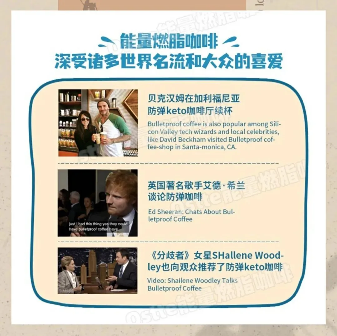 🌟球星贝克汉姆在防弹咖啡厅续杯 🌟《变形金刚》女主梅根·福克斯 🌟《超人归来》布兰登·罗斯等 都是防弹咖啡的粉丝