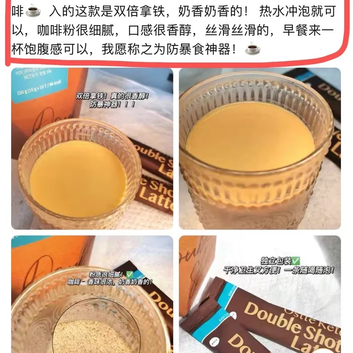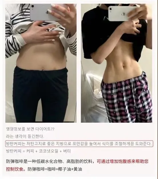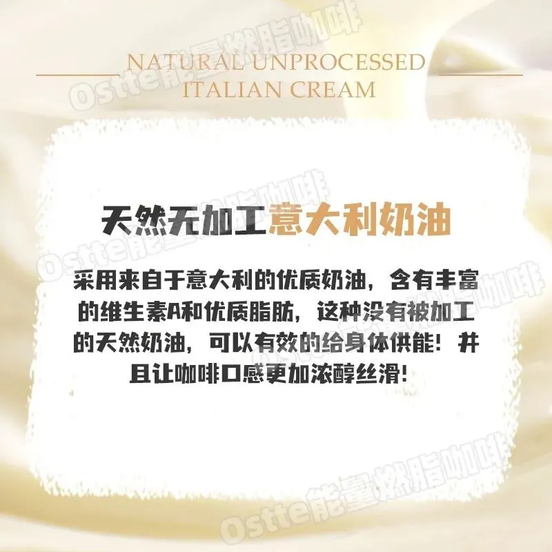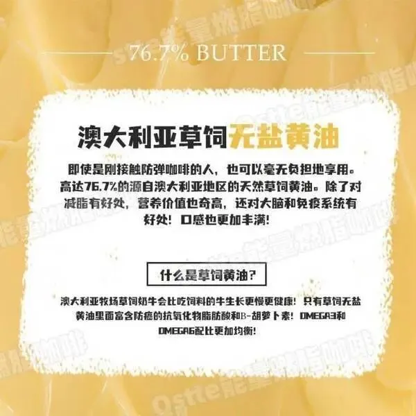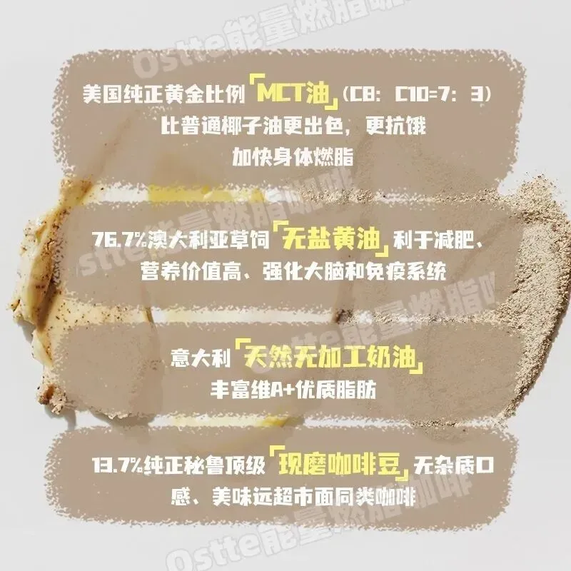 ——添加优质脂肪,5h饱腹控食欲以油燃脂👇 因为它选用优质黄金配比的美国MCT油 C8:C10=7:3,提高了中链脂肪酸的比例 睡觉也在燃脂~比普通防弹咖啡燃脂更出色! 喝一袋能抗饿5⃣️小时! ——澳大利亚草饲无盐黄油,燃脂加码👇 76.7%澳大利亚天然草饲无盐黄油🧈 除了对减脂有好处,营养价值也奇高 还对大脑和免疫系统有好处!口感也更加丰满! ——天然无加工意大利奶油营养充分👇 采用来自于意大利的优质奶油🍰 含有丰富的维生素A和优质脂肪 可以有效的给身体供能! 并且让咖啡☕️口感更加浓醇丝滑! ——最优质代糖,美味增值,放心不发胖👇 里面的代糖也是0⃣️卡天然优质代糖 阻糖不升血糖!促进新陈代谢,调节内分泌 提高免疫力!而且因为提取困难 价格昂贵 所以一般防弹咖啡很少添加!