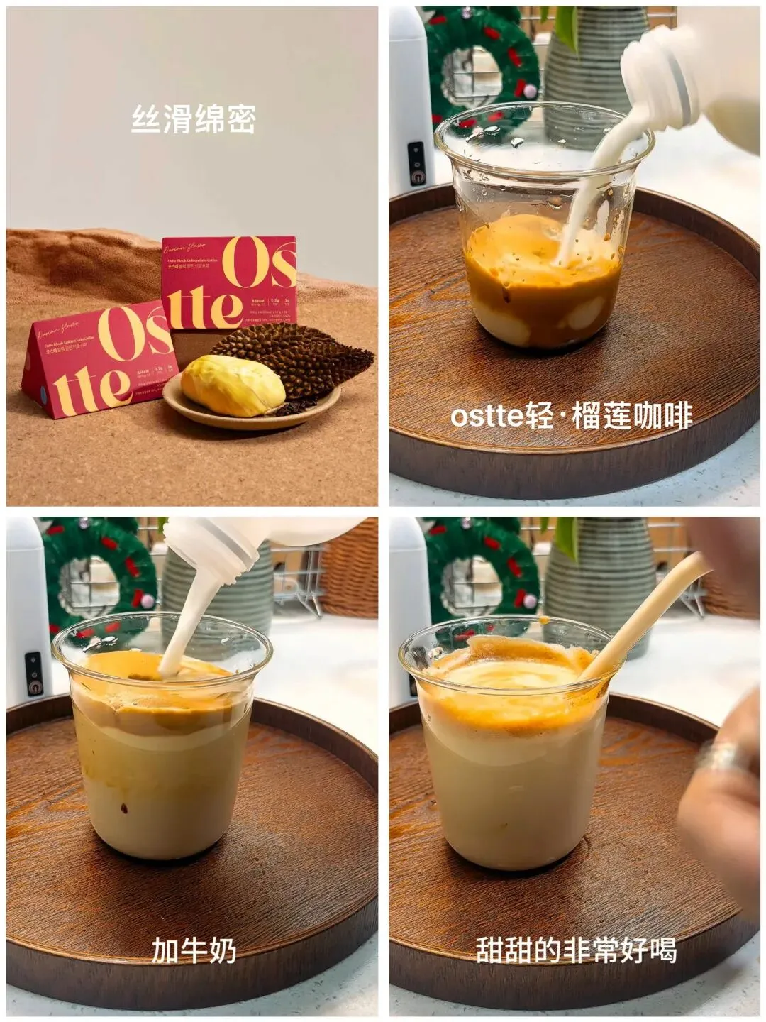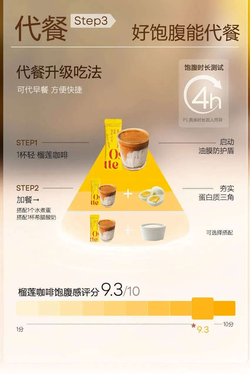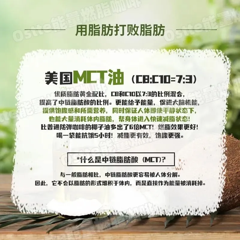 MCT油微囊包埋技术 👉采用德国BASF提供的食品级微囊材料 将MCT油滴包裹成0.1mm的微型胶囊 👉生物利用率提升68%!摄入后直接进入肝脏转化,实现"供能燃烧不囤脂"的代谢奇迹 (通俗说:喝下去的脂肪变成能量被燃烧,而不是存到腰上!) 一条仅65大卡!!! 比一颗小苹果还低!!! 还有很多花式搭配👇 你们可以自己去Get一下,不比“瘦”多了! 🟧代谢水=Ostte榴莲咖啡➕温水 🟧快乐水=Ostte榴莲咖啡➕冰块 🟧戒暴水=Ostte榴莲咖啡➕牛奶/椰奶 🟧解腻水=Ostte榴莲咖啡➕Ostte血橙饮 🟧超模水=Ostte榴莲咖啡➕Ostte燃断1000黑咖➕奇亚籽