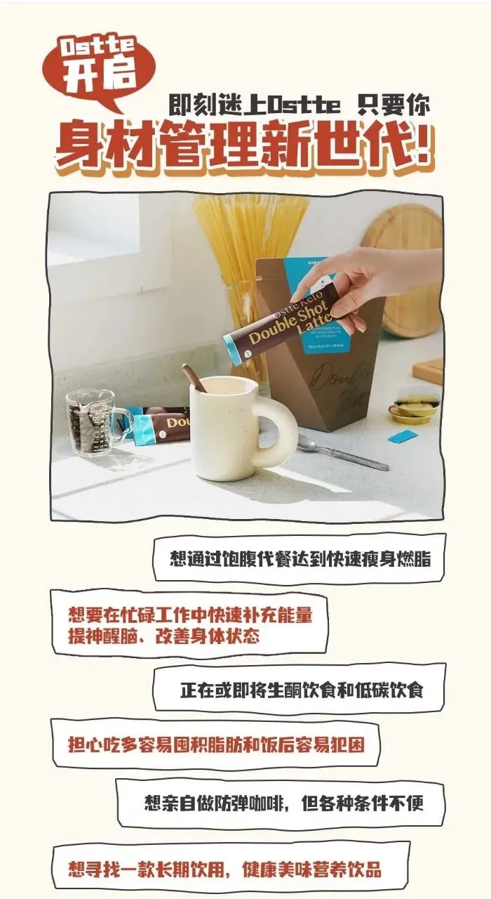 Ostte燃断1000黑美式 致力于通过创新科技与 全球科学家合作 探索对抗肥胖的答案 通过核心科技改变内在身体 让细胞新陈代谢从ostte开始 一打开包装就能闻到非常浓郁的咖啡味 夹杂着焦糖榛子的香味 超级香醇,粉质很细腻 冷热水皆可冲泡 完全不会结块! ✅平时容易水肿、爱熬夜、易便秘的宝子们 很推荐这款黑咖啡哦! 快速提高代谢3-11%,立马消肿瘦两圈~ 想快速减掉大体重的姐妹→1天2条! 日常没有喝美式习惯的→1天1条! 运动前20~30分钟一杯, 瘦身效果翻倍、改善疲劳!