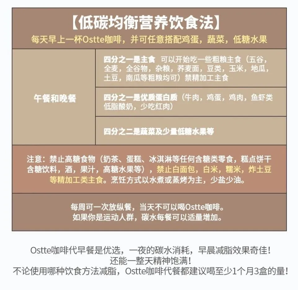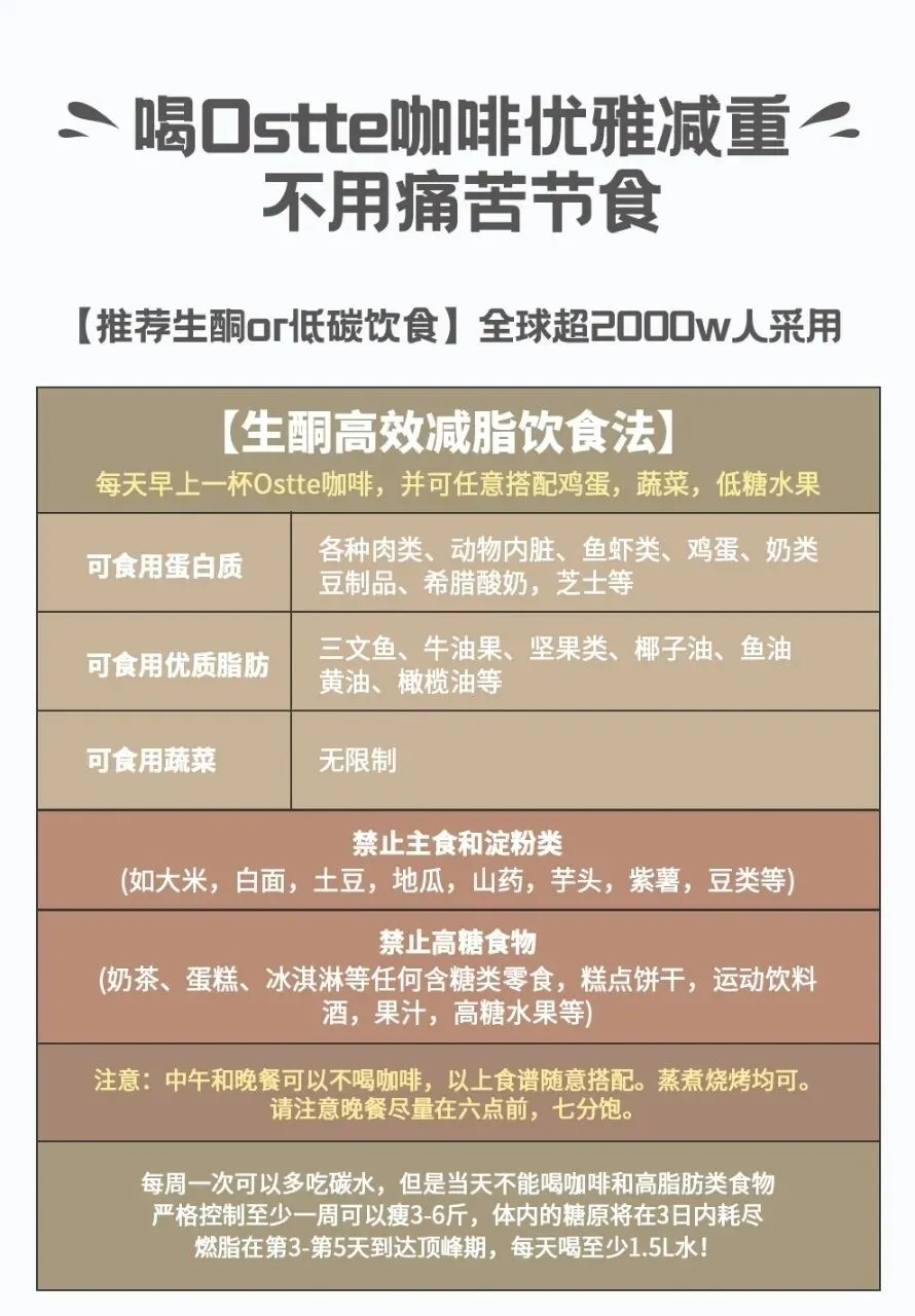 建议饮食方式👇 喝Ostte咖啡代餐瘦身 每一餐搭配25%的低碳粗粮主食就可以 另25%蛋白质肉蛋🥚都可以照常吃 一半量的蔬菜和低糖水果! 只要保证低油低盐低糖! 另外每天多喝水~ 这样健康又高效的瘦身方式经过世界2000万人验证! 生酮饮食或低碳饮食两种方式任选 都可以有效达到快速减脂目的!