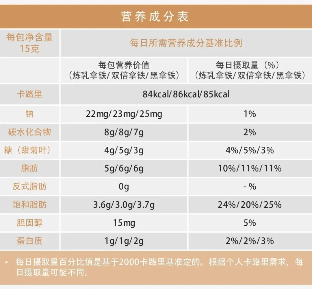 【口味】 🍶 炼乳拿铁——略微甜香的奶油口感,丝滑美味,适合喜欢甜一些咖啡人群(15g,84kcal) ☕双倍拿铁——浓郁的咖啡烘焙风味,咖啡和牛奶的完美融合,味道极佳(15g,86kcal) ☕☕浓缩黑拿铁——醇厚黑咖风味,浓缩更多含量100%秘鲁咖啡,适合爱好美式黑咖人群享用(15g,85kcal)