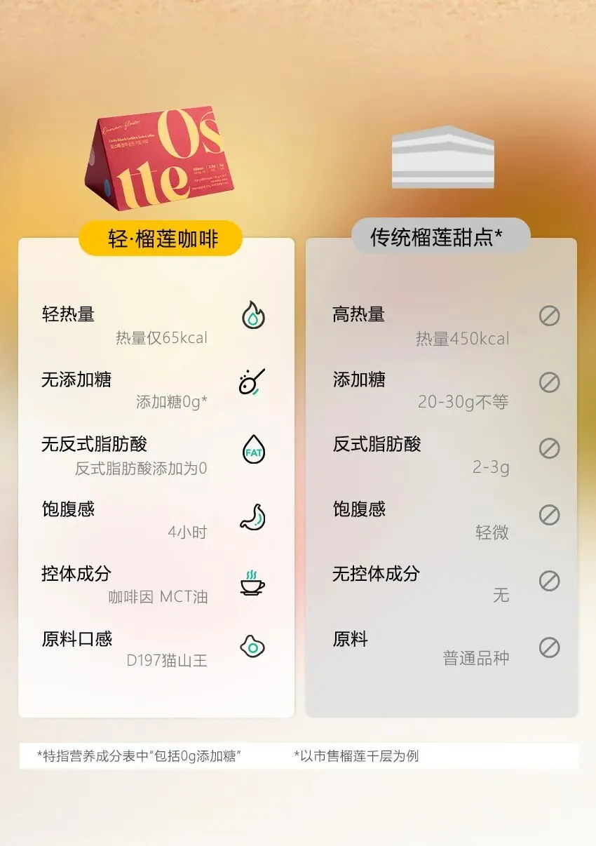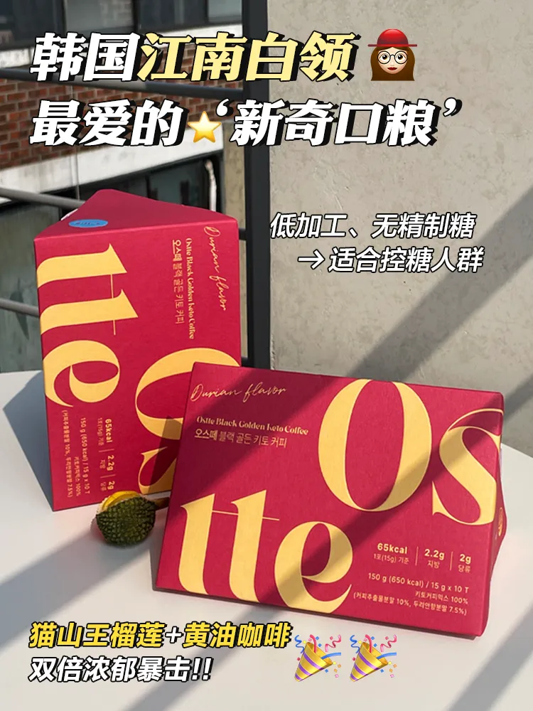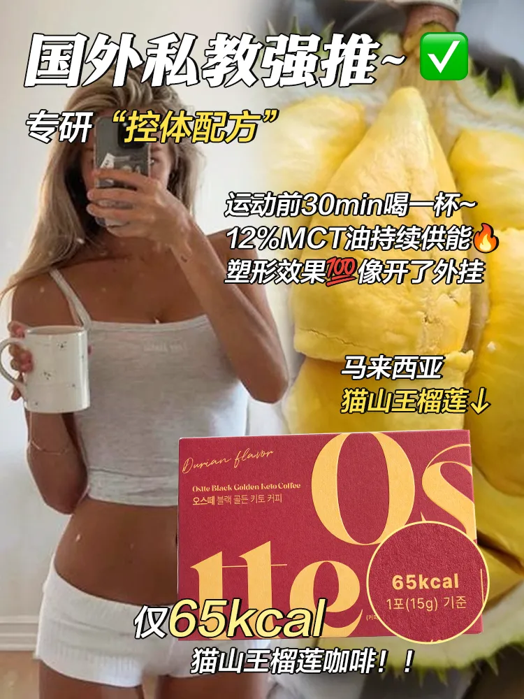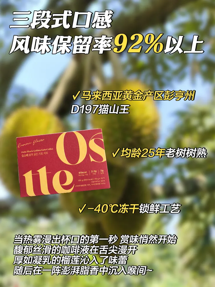 🔺【OstteD197猫山王榴莲咖啡】 这是一款让榴莲控&减脂人 充满幸福感的咖啡!!! 首尔大学食品科学研究院【专研控体配方】 📈MCT微油囊粉24h供能燃烧脂肪 🚫节食🚫戒断🚫添加糖🚫反式脂肪 ☄️1条浓缩5块猫山王果肉的精华 热量却远远低于新鲜榴莲肉!! 吃进去一点都不会囤积肉肉 🔥边吃边燃烧完全没有负担~ 一口回到马来彭亨州的猫山王老树下 搭配中深度咖啡豆~口感柔滑绵密 榴莲果肉的甜度、香气都浸润了整个口腔~ 爱吃榴莲的宝们这一杯咖啡简直会爱住!