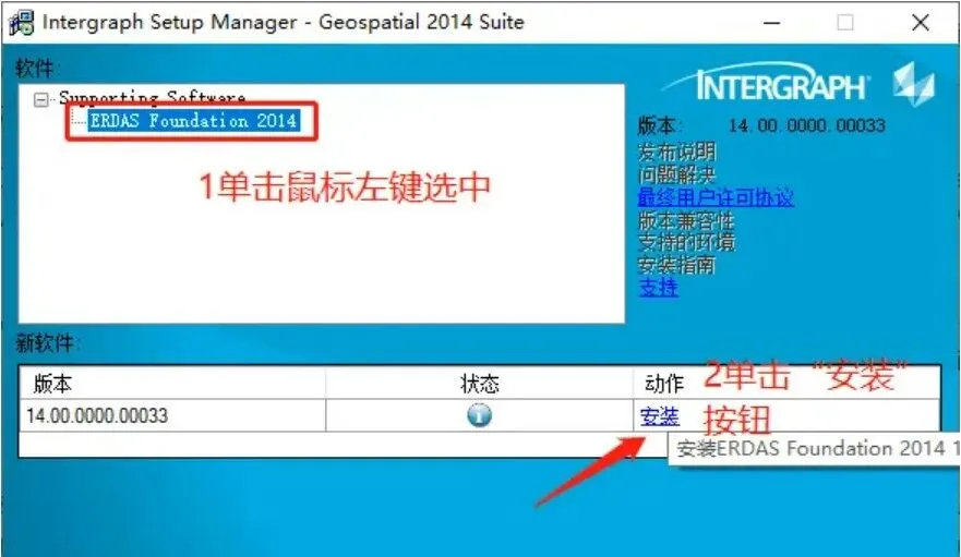 5、展开Supporting Software下的ERDAS Foundation 2014,单击鼠标左键选中它,然后下方出现【安装】按钮,单击“安装”按钮进行安装。