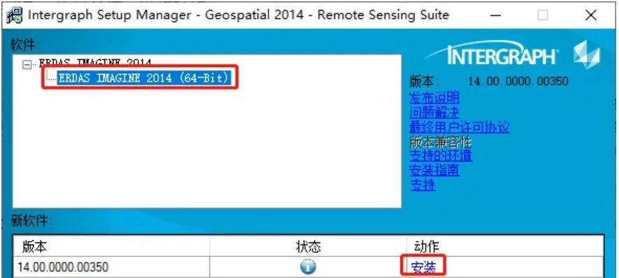 13、和上一步的界面类似,展开【ERDAS IMAGINE 2014】,鼠标选中【ERDAS IMAGINE 2014(64-Bit)】,点击出现的“安装”按钮。
