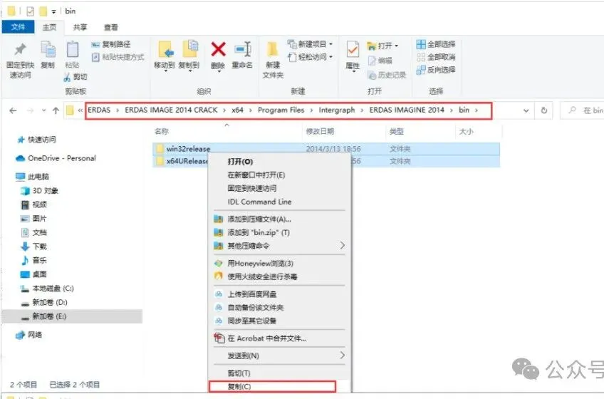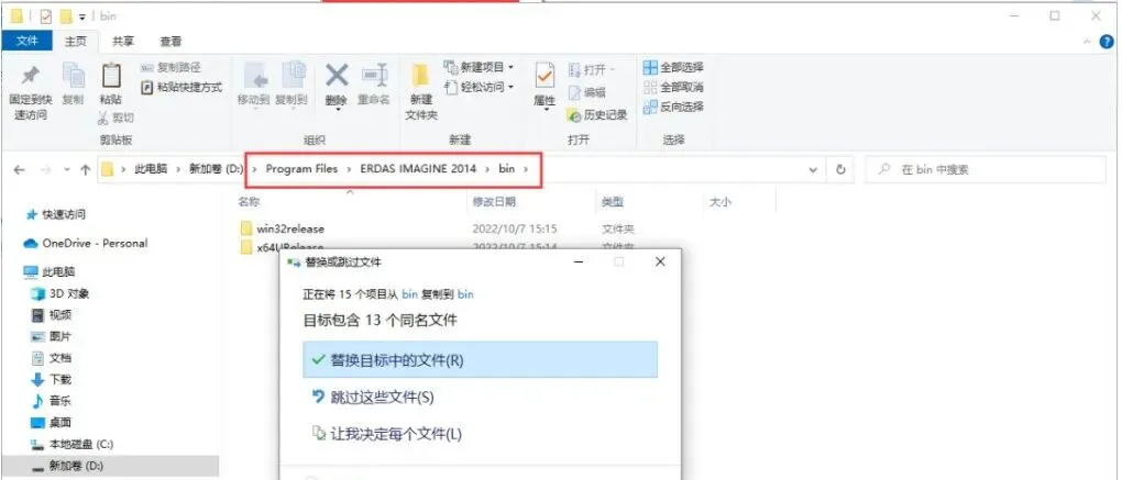 1、打开文件夹【ERDAS IMAGE 2014 CRACK】→【x64】→【Program Files】→【Intergraph】→【ERDAS IMAGINE 2014】→【bin】,将里面的两个文件复制到安装目录下,示例中安装目录为(D:\Program Files\ERDAS IMAGING 2014\bin),如下图所示,粘贴替换里面的文件。注意:软件安装目录一定要找对。