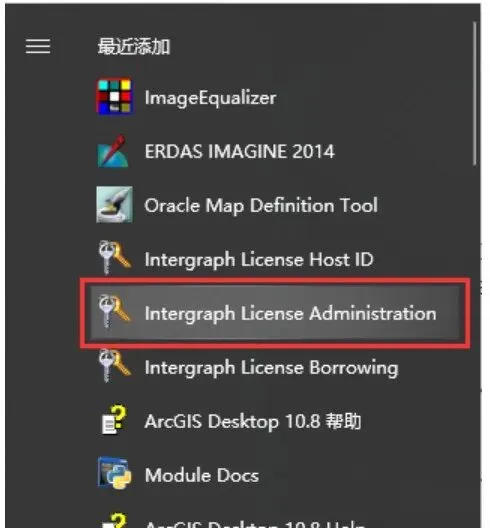 3、点击电脑“开始”按钮,找到新添加的Intergraph License Administration,点击进入。