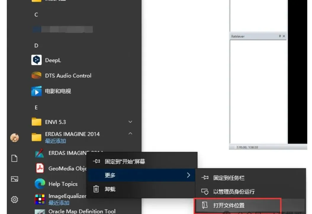 8、可以看到成功打开了软件,可以将其快捷方式放置电脑桌面,以便打开使用,方法如下,在开始菜单栏中,找到ERDAS IMAGINE 2014,单击鼠标右键,选择【更多】→【打开文件位置】,如下图: