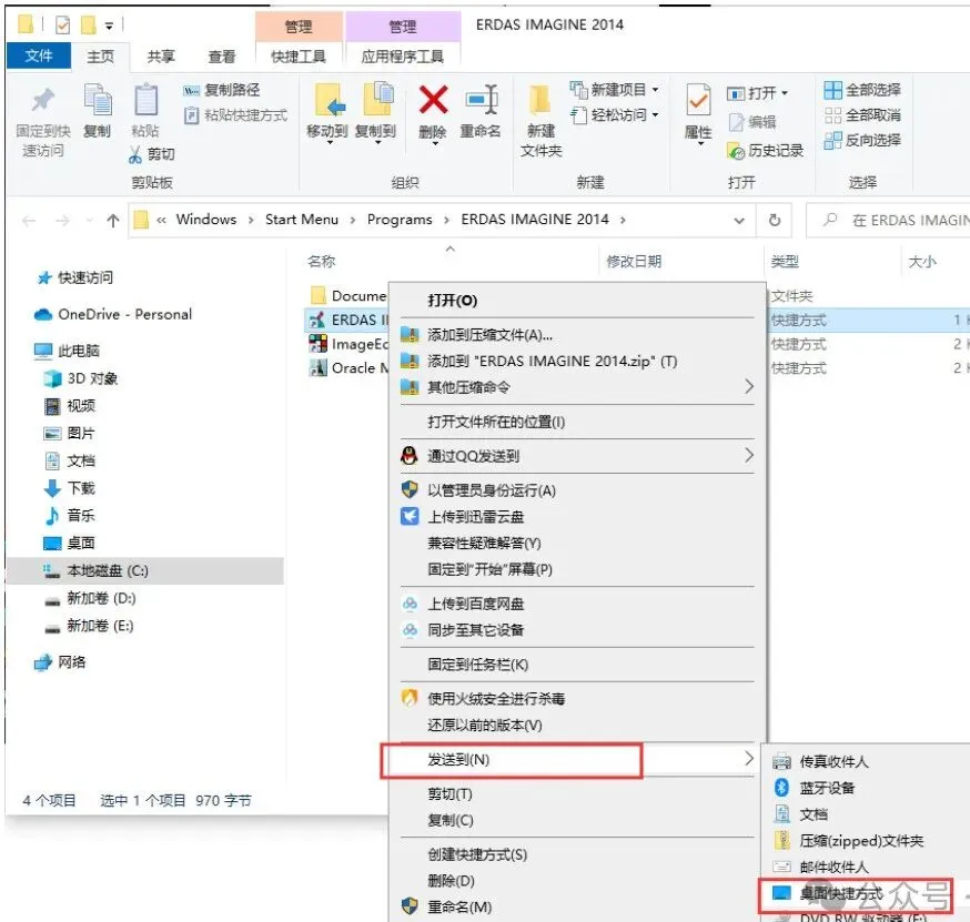 9、系统自动定位至该文件位置,单击鼠标右键,选择【发送到】→【桌面快捷方式】即可,如下图所示: