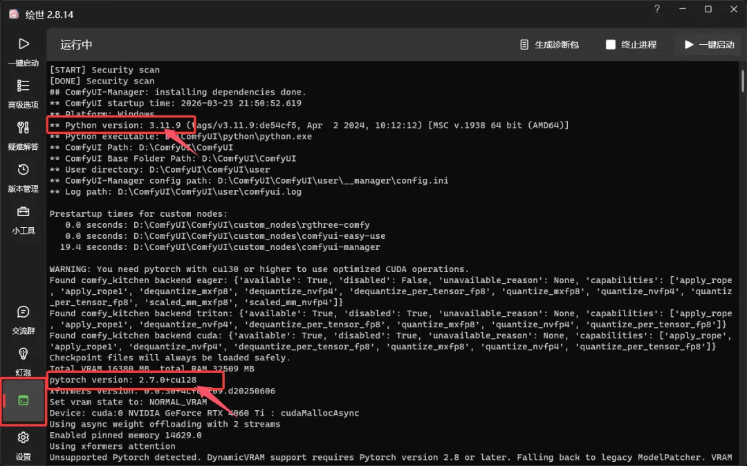 准备工作:已安装并能正常运行Comfyui,有 Python 3.8+ 环境,有 NVIDIA GPU(CUDA) 更佳,可大幅加速推理。开启启动器,在控制台查看cuda和python版本。例如这里是:python 3.11,CUDA 12.8