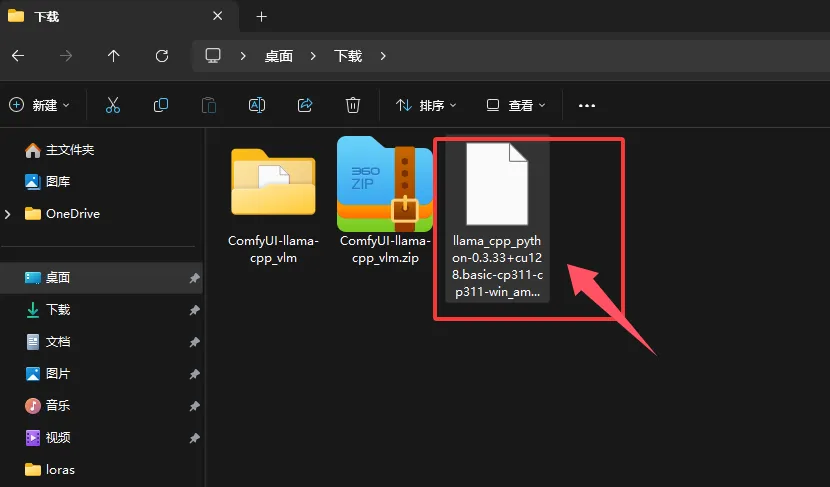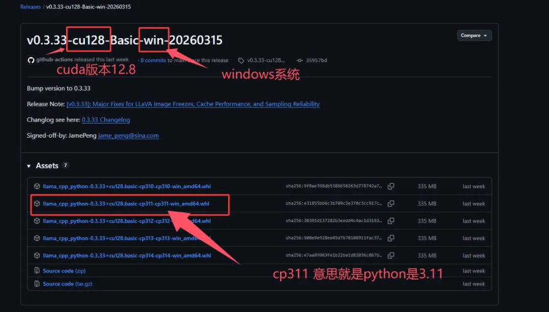 下载轮子文件:根据系统类型,找到与cuda和python版本相匹配的轮子(wheel)文件,并下载到本,下载地址如下:https://github.com/JamePeng/llama-cpp-python/releases