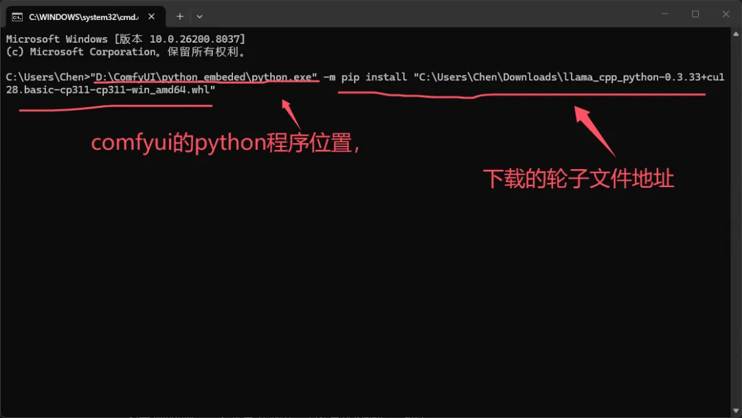安装轮子文件:记住轮子文件存放的路径,并将其复制。打开CMD命令窗口,按照以下步骤进行安装:首先查看comfyui的python程序地址,然后按照以下方式在cmd命令窗口输入命令,点击回车即可。