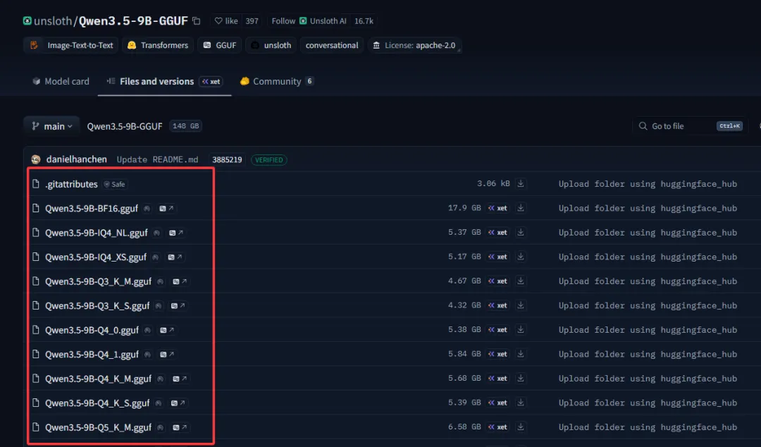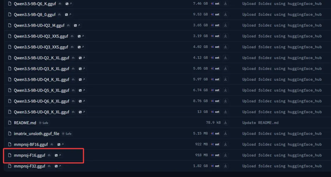 主模型文件:推荐Qwen3.5-9B-Q4_K_M.gguf(9B参数版本),下载地址如下:https://huggingface.co/unsloth/Qwen3.5-9B-GGUF/tree/main