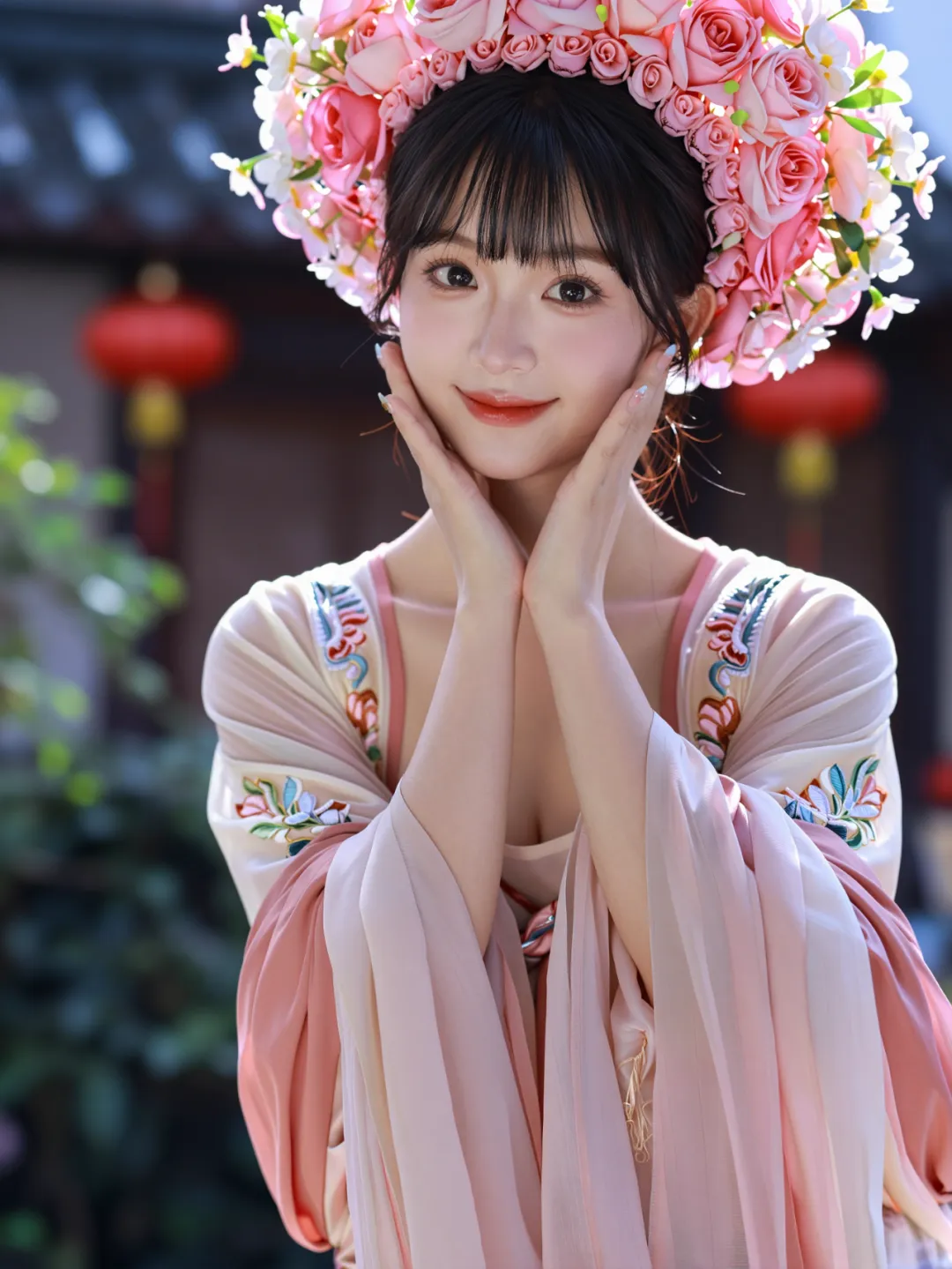 她头戴一顶硕大而繁复的花冠,由层层叠叠的粉白玫瑰、娇嫩的白色小花和翠绿叶片交织而成,如同盛开在头顶的花园,为她增添了一层浪漫唯美的童话色彩。她的发丝乌黑柔顺,被花冠巧妙地束起,几缕碎发自然垂落,更显灵动。