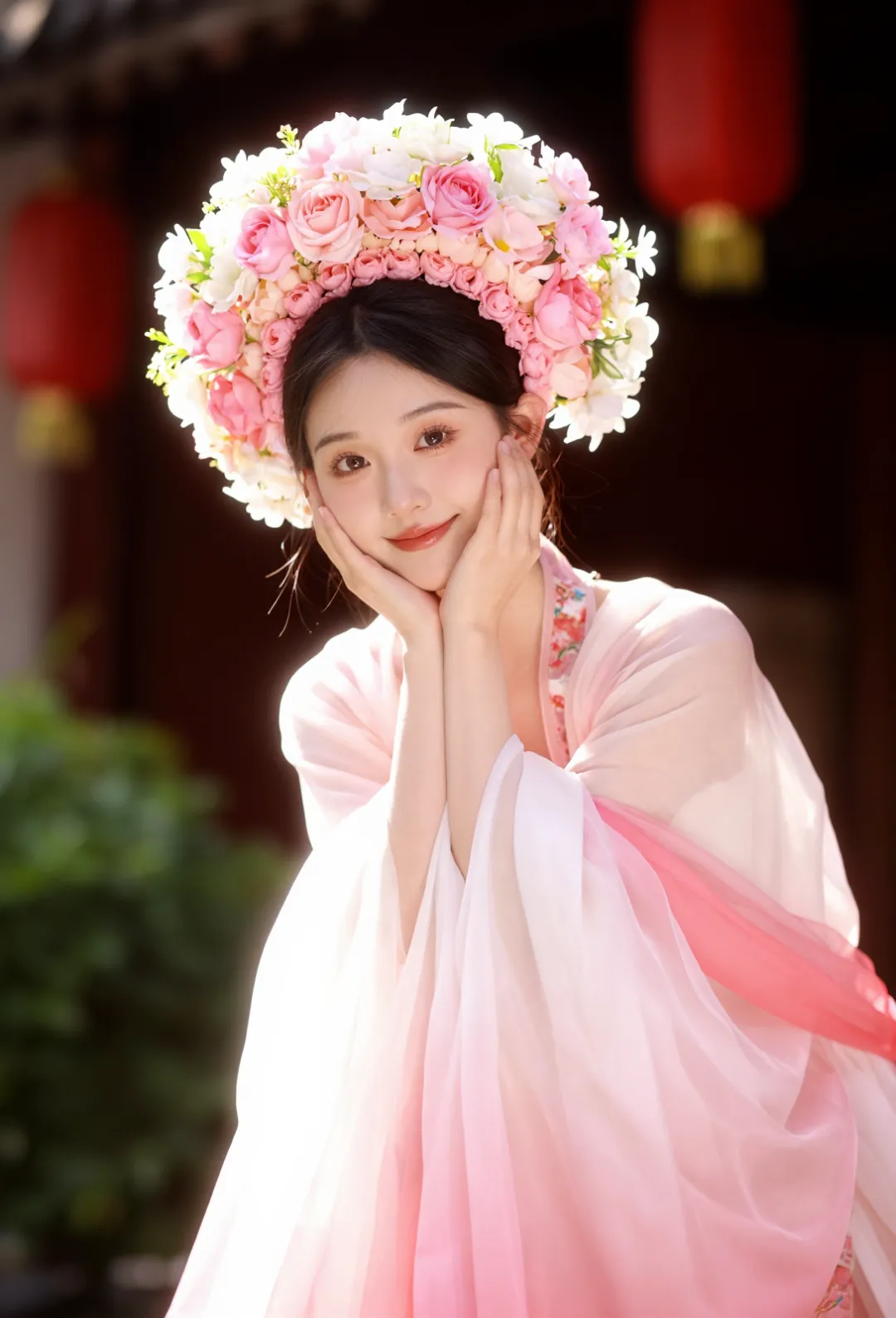 构图上,采用经典的中近景人像构图,人物占据画面中心,镜头聚焦于她的面部与上半身,背景被虚化处理,突出了主体。光线柔和温暖,主要光源来自人物的正面偏左,均匀地照亮她的面部,使其轮廓清晰,肌肤质感细腻。整体画面色调柔和温暖,以粉色、白色和红色为主,营造出一种梦幻、甜美、温柔且充满生命力的视觉效果。画面呈现出一种强烈的“电影感”,仿佛来自一部唯美古风电影的剧照。