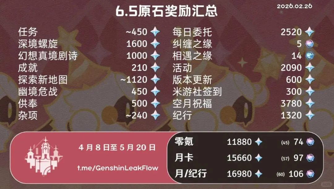 版本福利方面,6.5原石总量已统计完毕:大小月卡党最高可攒106抽,零氪玩家也能稳定获取74抽,不管是冲新角色还是补复刻,都足够从容。