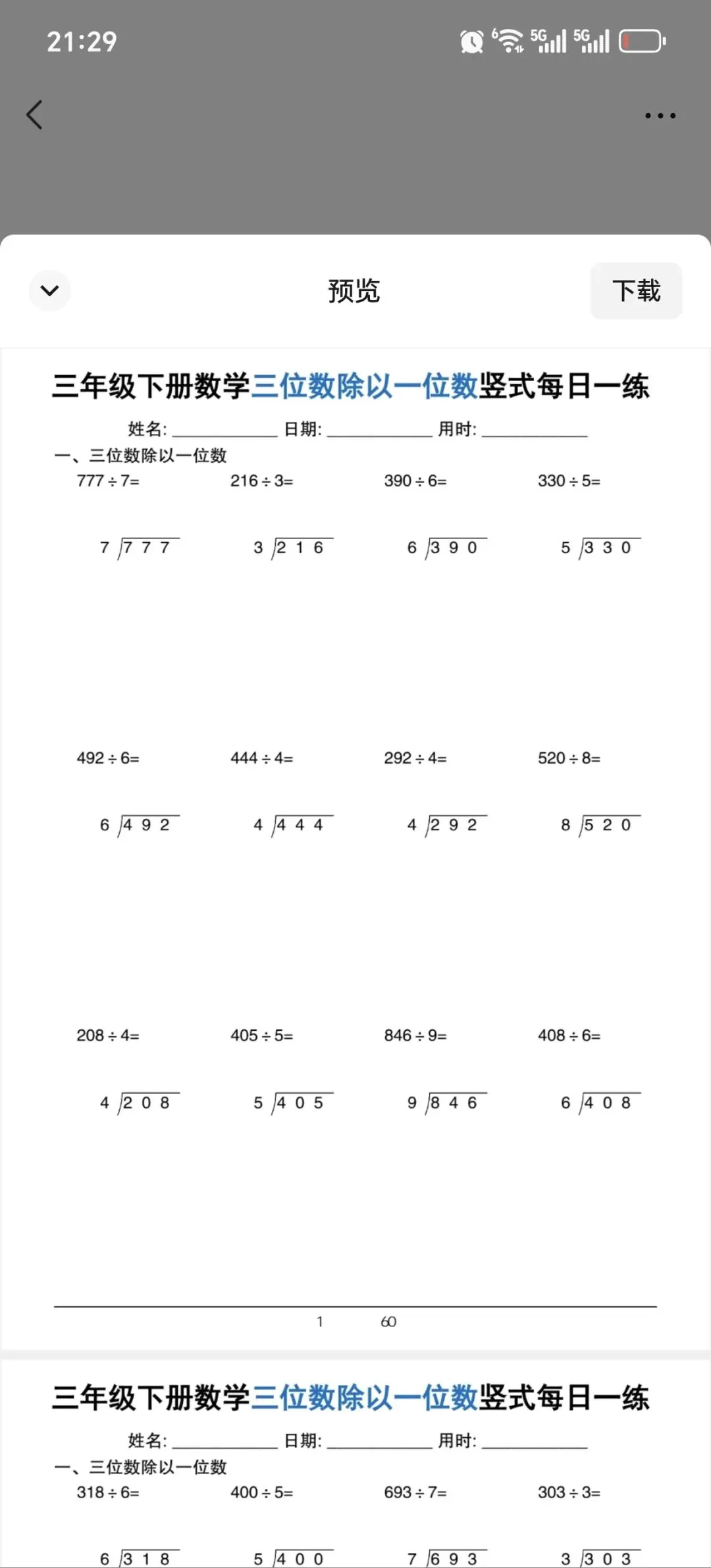 !②:在公众号对话框中回复:三位数除以一位数竖式每日一练