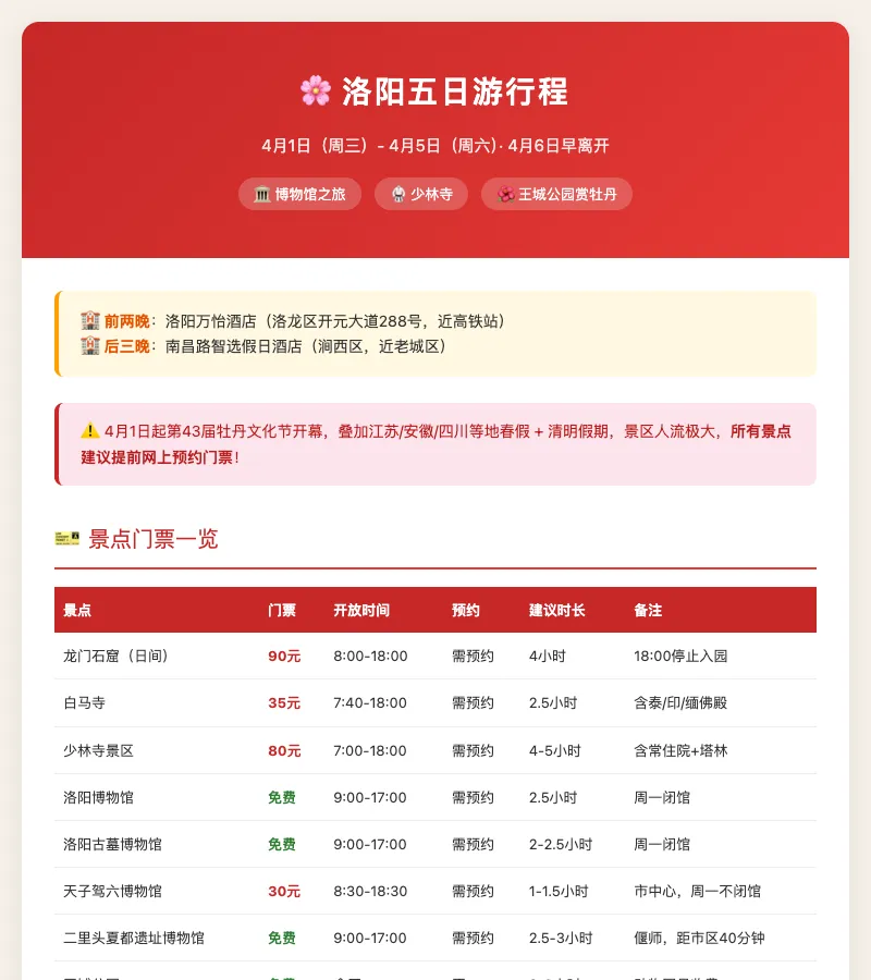 1. 读取你的攻略内容2. 提取所有景点、酒店的名称和坐标3. 按天分色画出路线(Day1 粉色、Day2 紫色…)4. 生成一个可交互的 HTML 地图页面