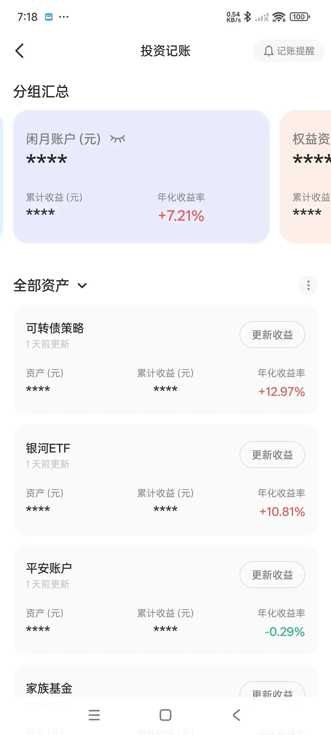 上面的汇总可以自由选择下方已建立的几个资产进行汇总,方便分开自己和家人的资产。比如设置个家庭基金什么的,是很方便的。