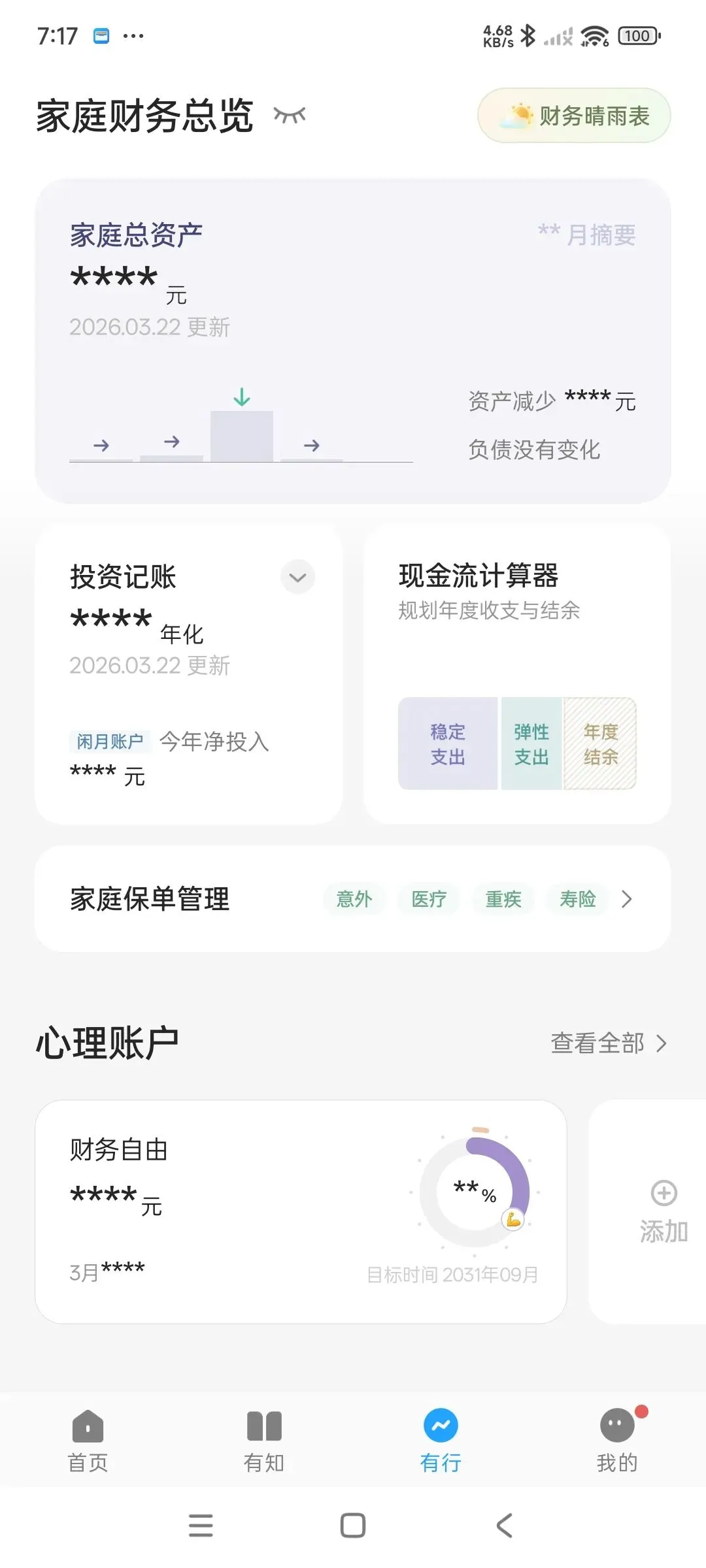 记账App记录平时的支出&收入流水,知道钱的去向;有知有行App记录投资理财,了解盈亏&收益情况,两者结合,能很好了解自身的财务情况。