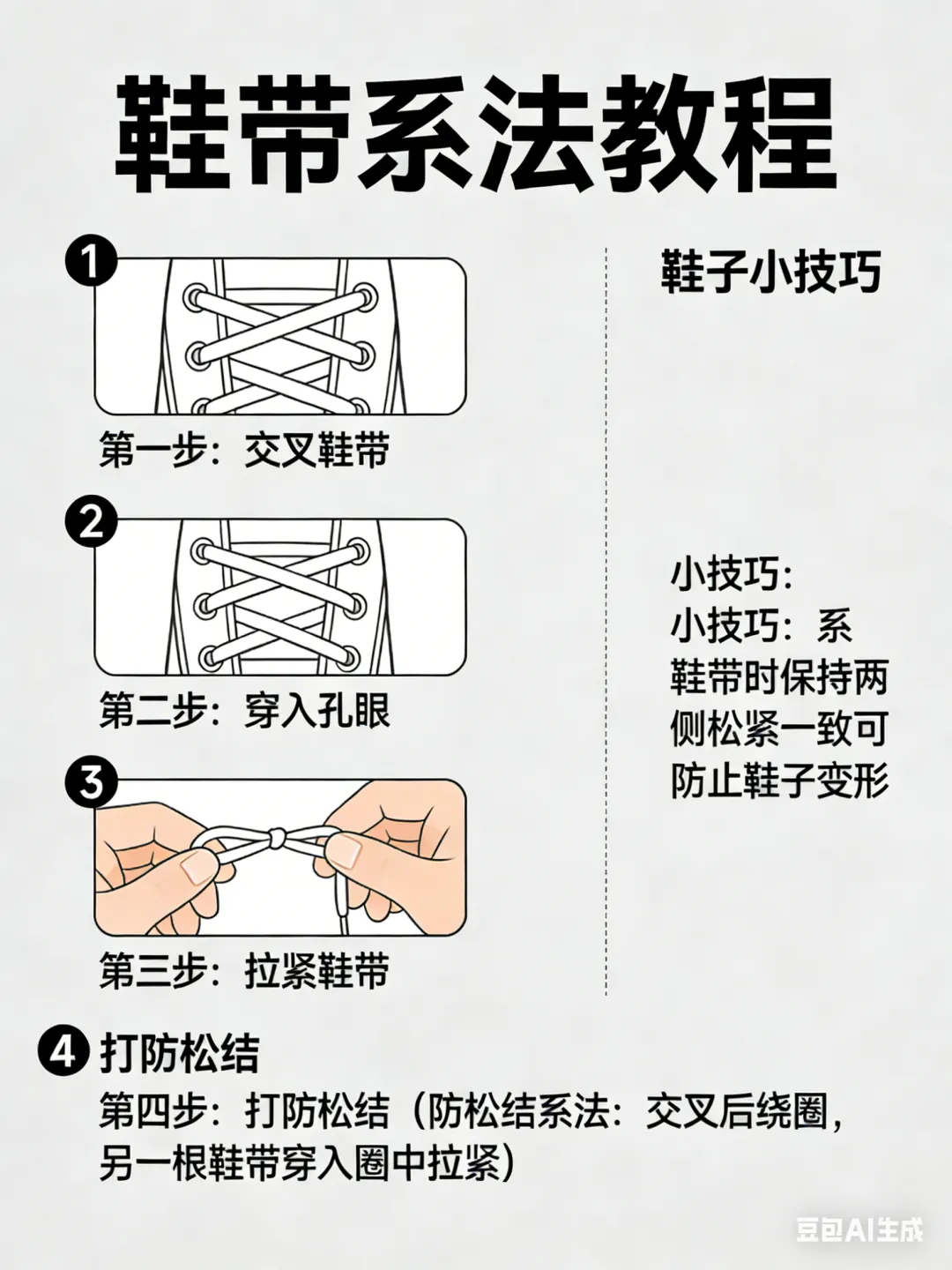 其实系鞋带的时候,最后一圈多绕一下、交叉穿进绳环里,会牢固很多,不容易散,出门也省心。