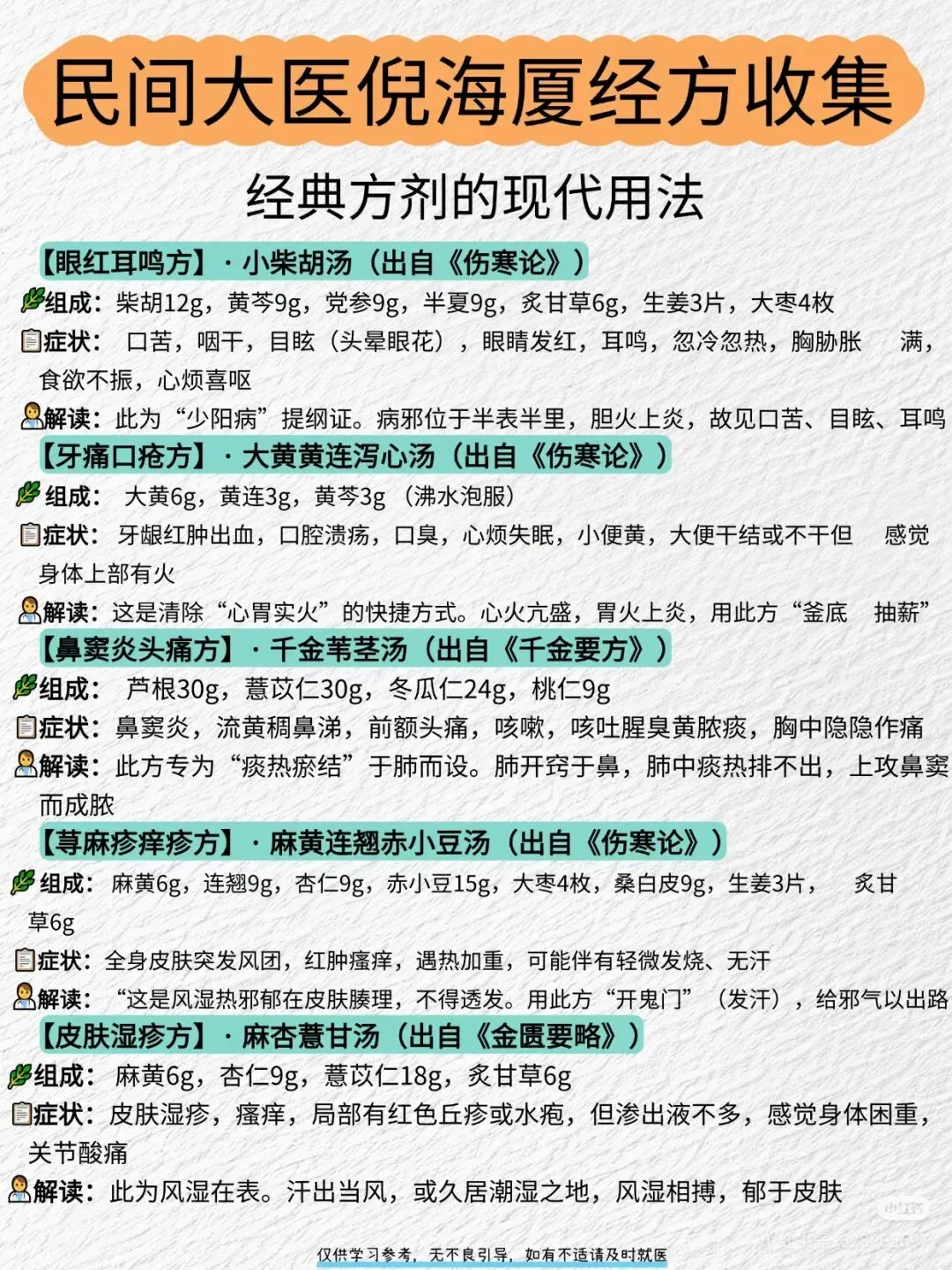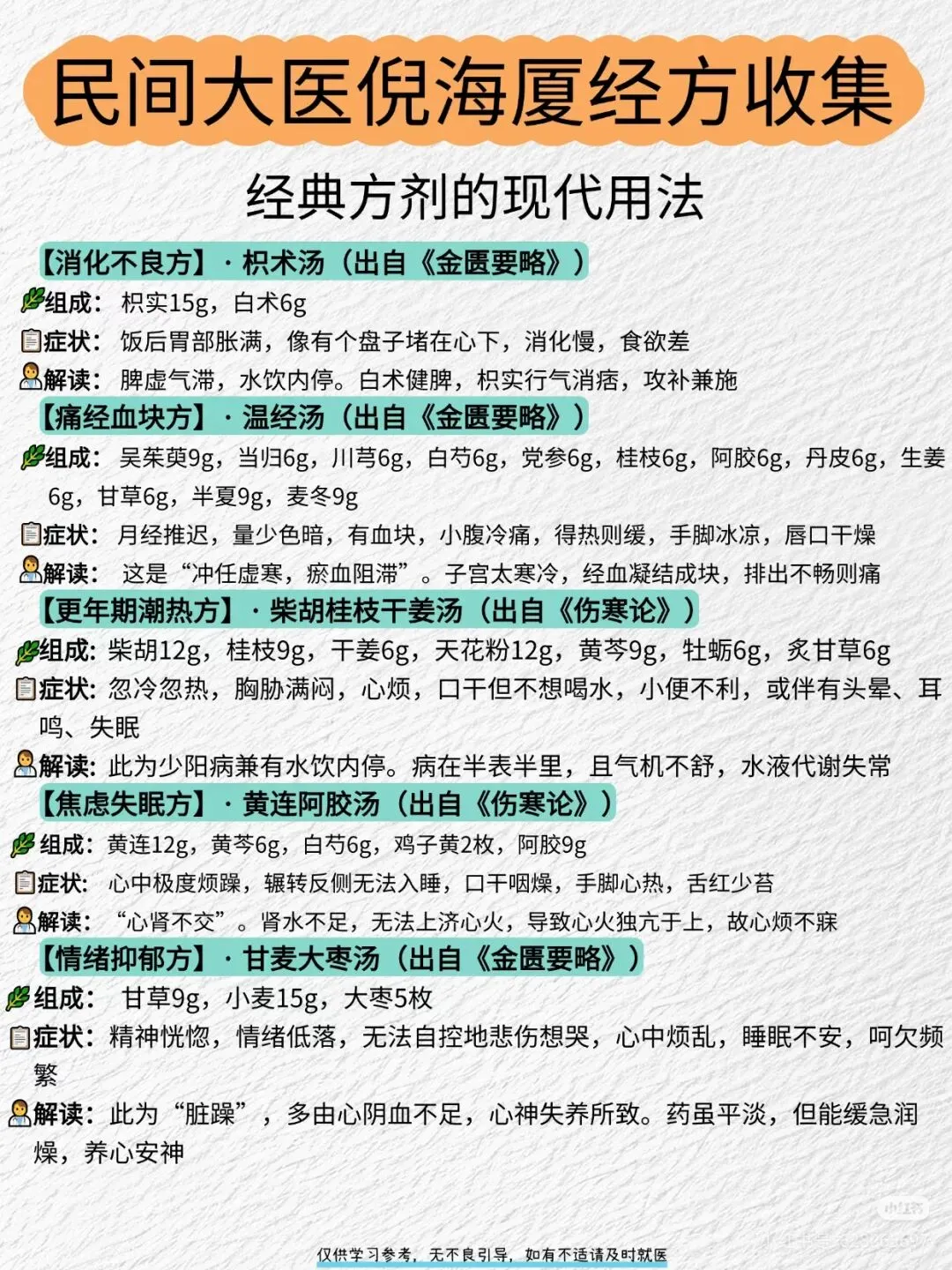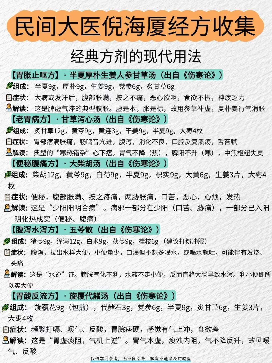 🔥 一份基于倪海厦老师学术思想的40首方剂参考合集,合集旨在梳理倪师如何灵活运用张仲景经方,并结合其个人临床经验,为解决皮肤、肠胃、妇科、感冒等常见问题提供的思路。