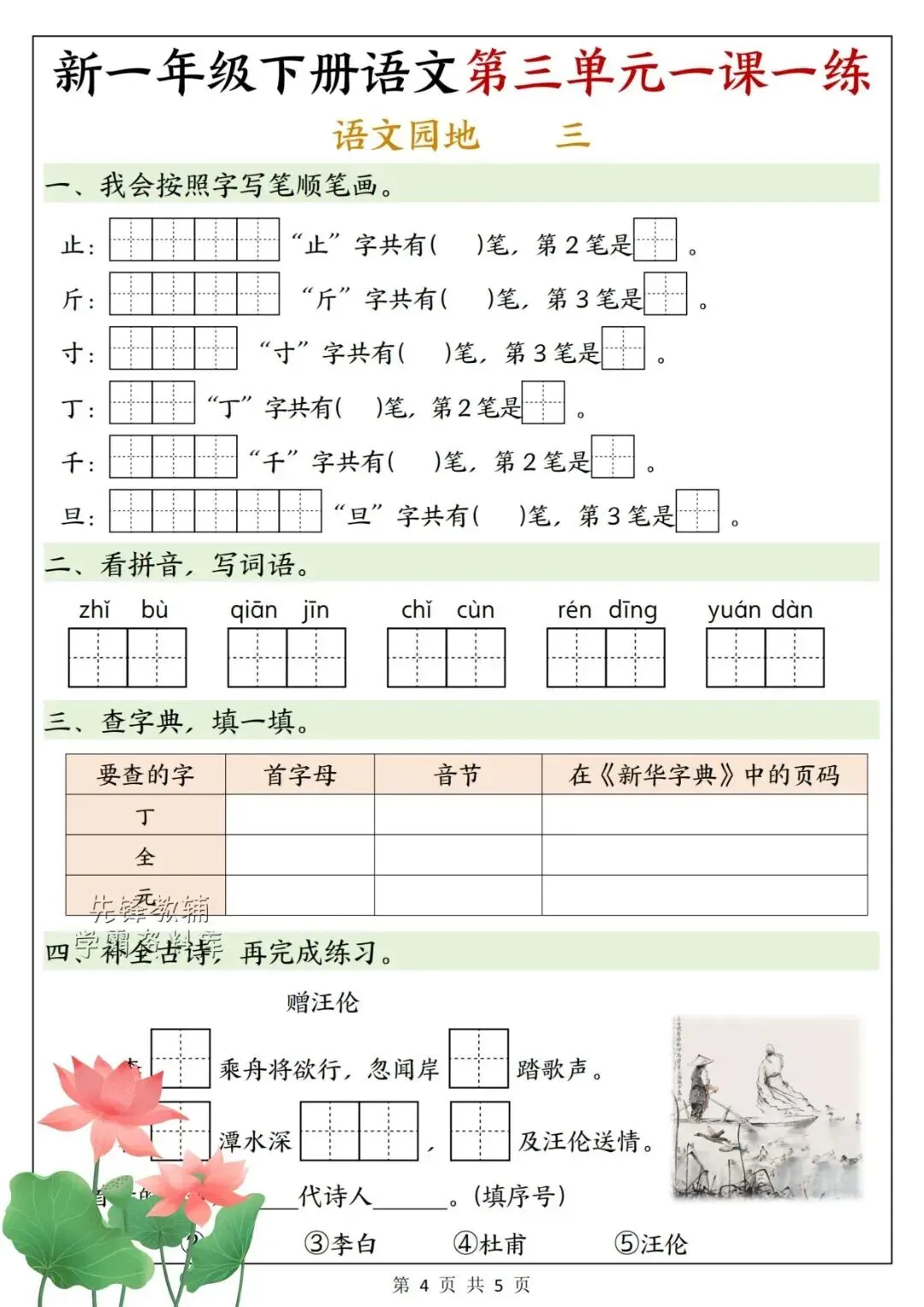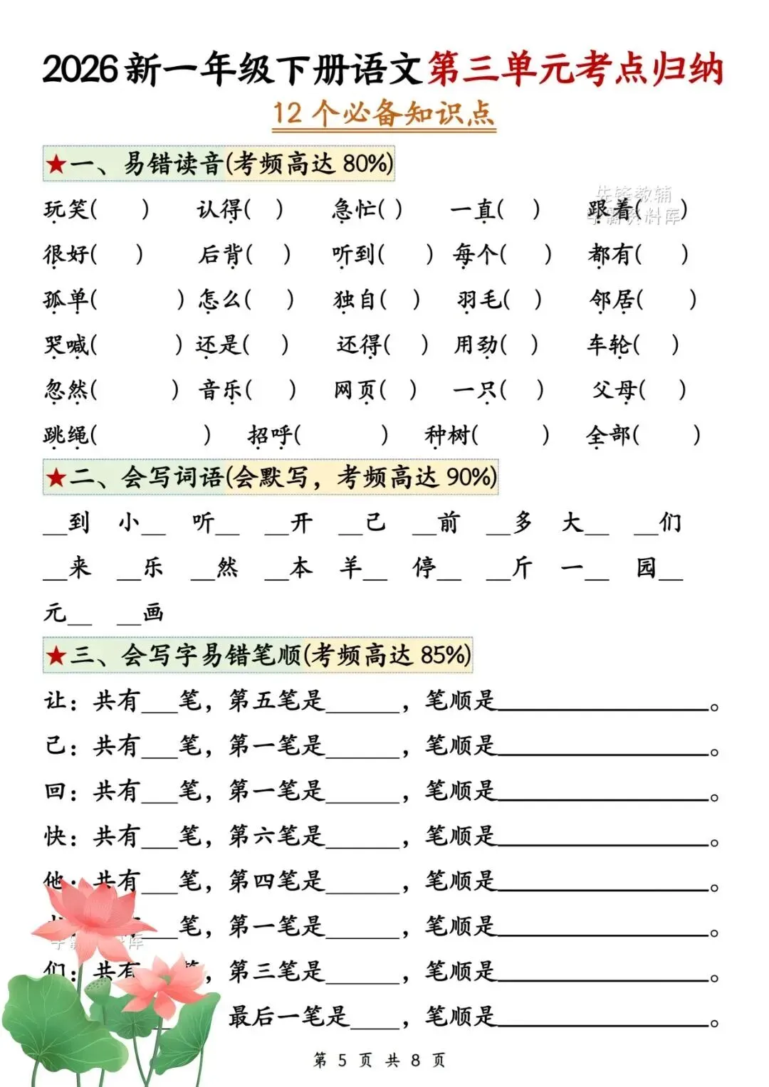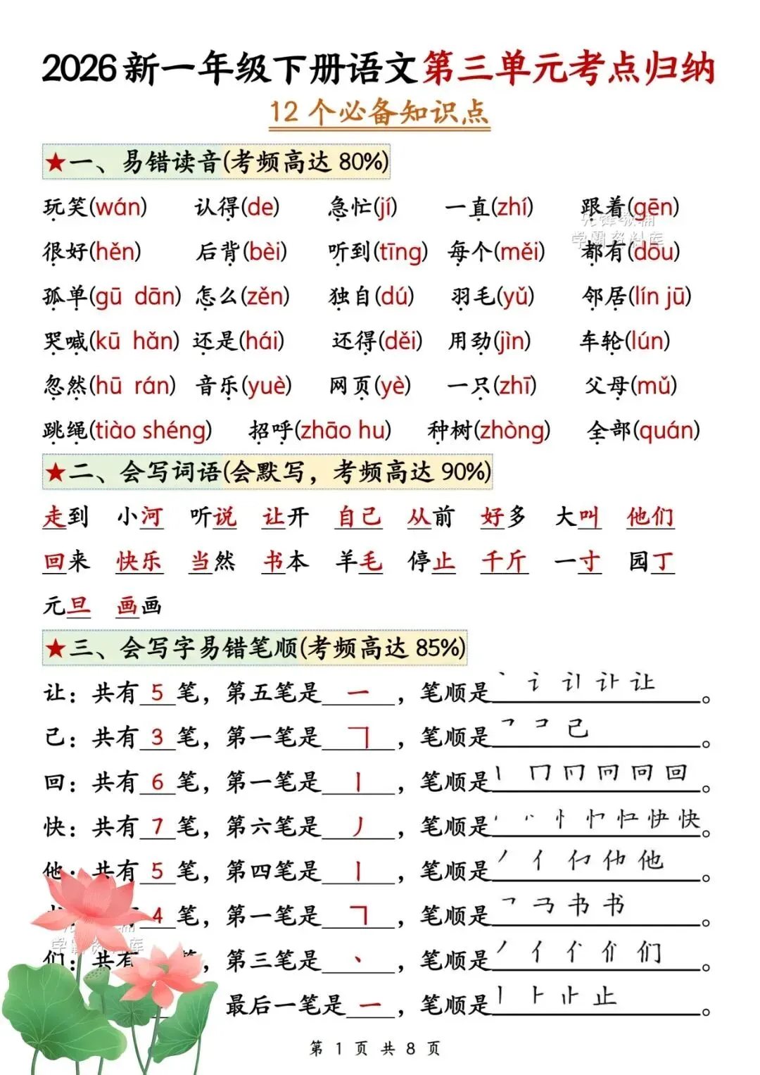 2026年春《一年级下册语文第三单元考点+练习,一份搞定单元复习》电子版