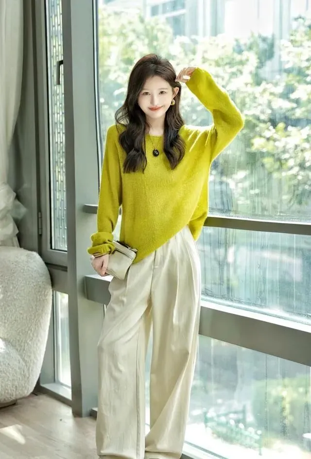 圆领款 , 选颜色柔和的 , 搭高腰直筒裤或者A字裙 , 干净利落。 上班能穿 , 周末出门也不突兀 , 属于闭眼入都不出错的那种。