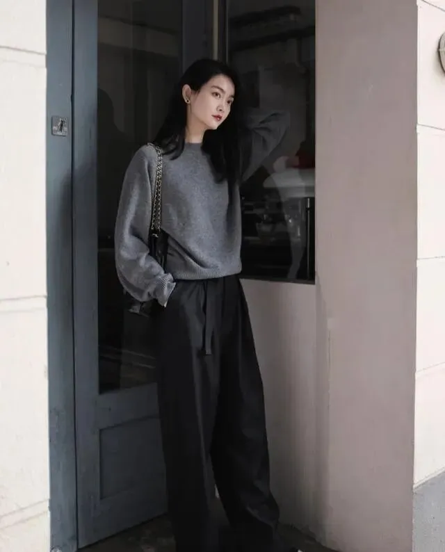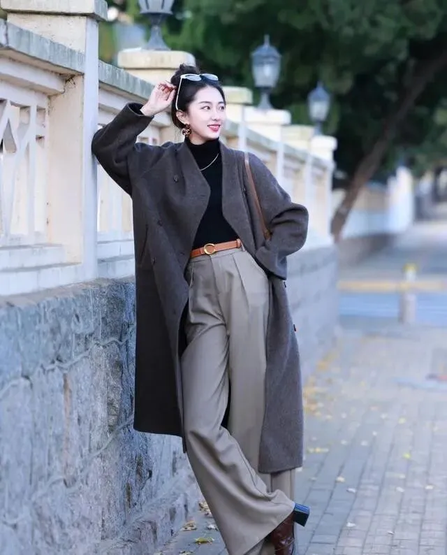 再冷一点的时候 , 修身针织衫打底加大衣 , 贴合身形的内搭和宽松廓形的外套形成对比 , 又暖又高级 , 这个思路到冬天也照样能用。
