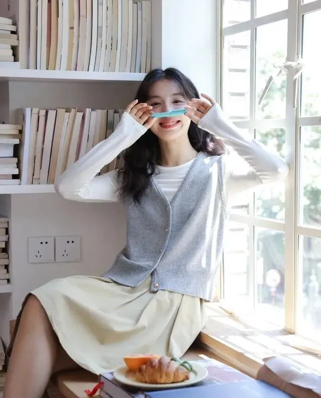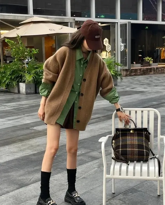 还有一个我超爱的穿法 , 针织开衫当中间层 , 里面套一件衬衫。