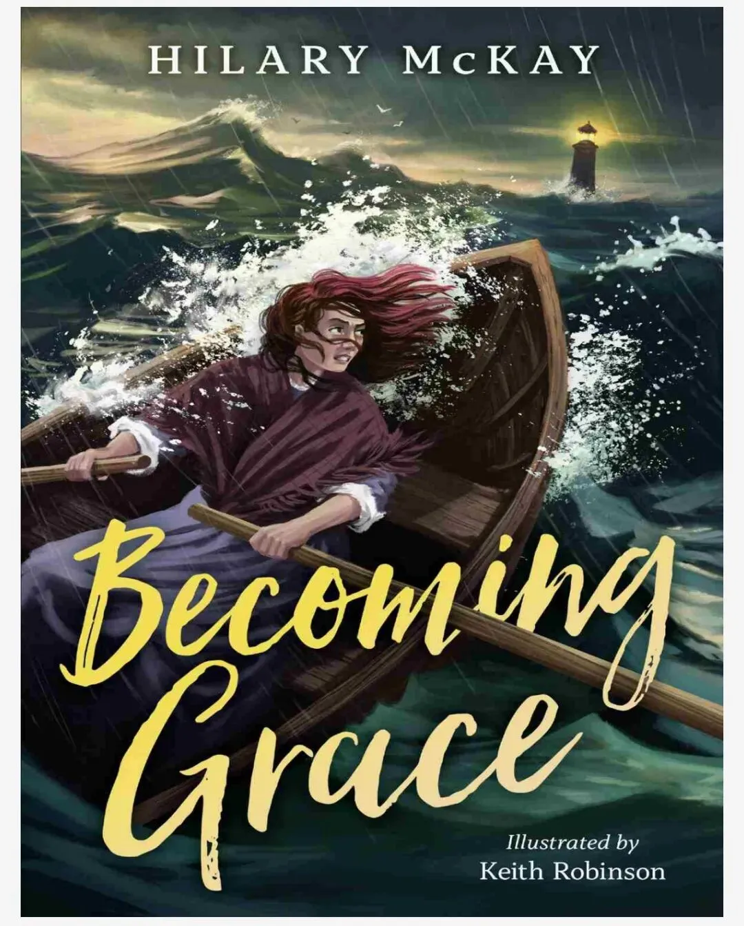 “Becoming Grace”直译为“成为格蕾丝”,其中“Grace”既指主角的名字,也象征着“优雅”“恩典”或“内在力量”。书名暗示了主角在经历风雨与挑战后,逐步成长为拥有坚韧品格与内心力量的少女。封面中女孩在风暴中划船、灯塔在远方亮起,正是这一主题的视觉化表达——在混乱与危险中寻找方向,最终抵达自我认同的彼岸。