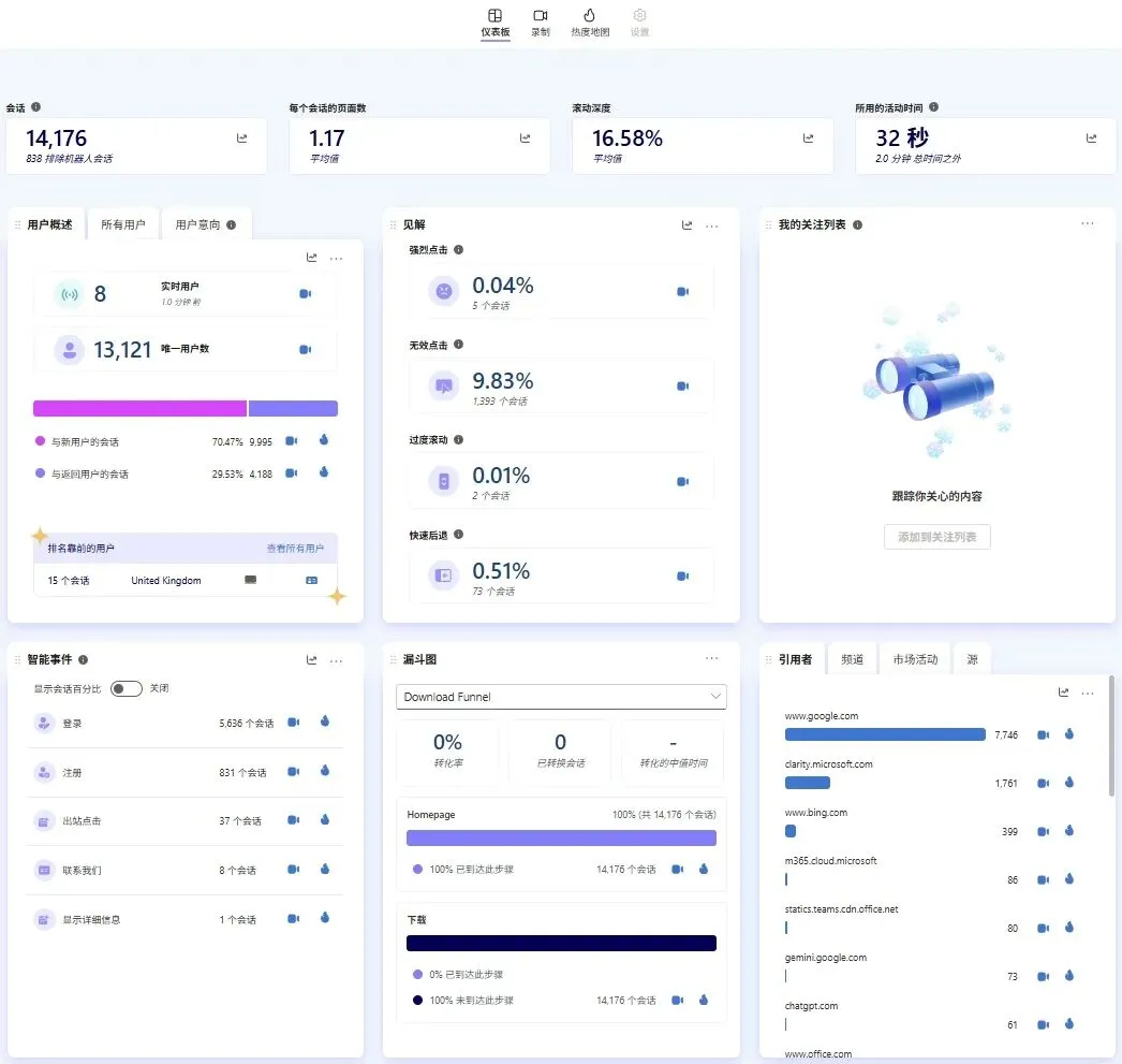 注册 Clarity 账户为你的网站创建项目并在网站上正确安装 Clarity 追踪代码后,便可在 Clarity 后台仪表板查看网站相关统计分析数据,