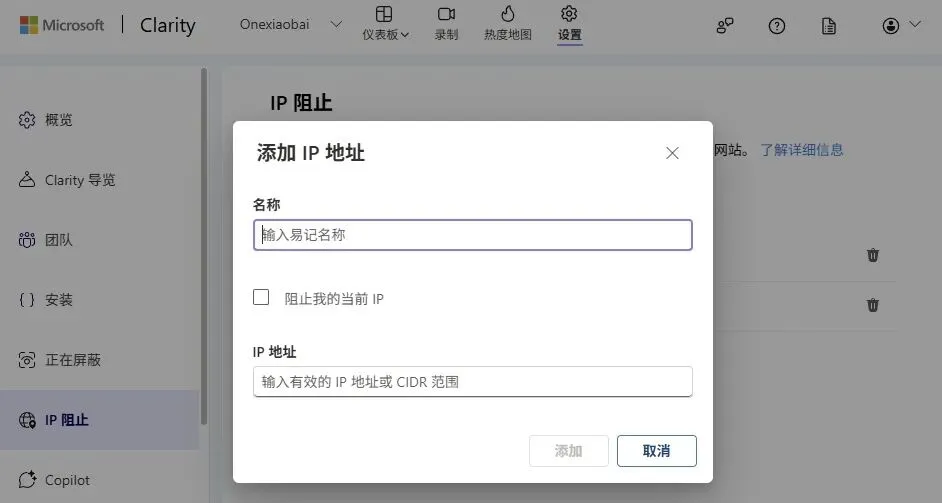 在弹出窗口中,添加要阻止的 IP 地址,Clarity 后台设置的 IP 地址排除仅支持 IPv4 地址,不支持 IPv6 或动态 IP 地址,此外,移动设备也不支持用于 IP 地址排除。