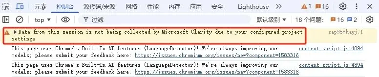 F12 打开浏览器开发者工具,对于已设置阻止的 IP 地址,控制台顶部会显示一条消息 “由于您配置的项目设置,Microsoft Clarity 不会收集此会话的数据”(Data from this session is not being collected by Microsoft Clarity due to your configured project settings)。