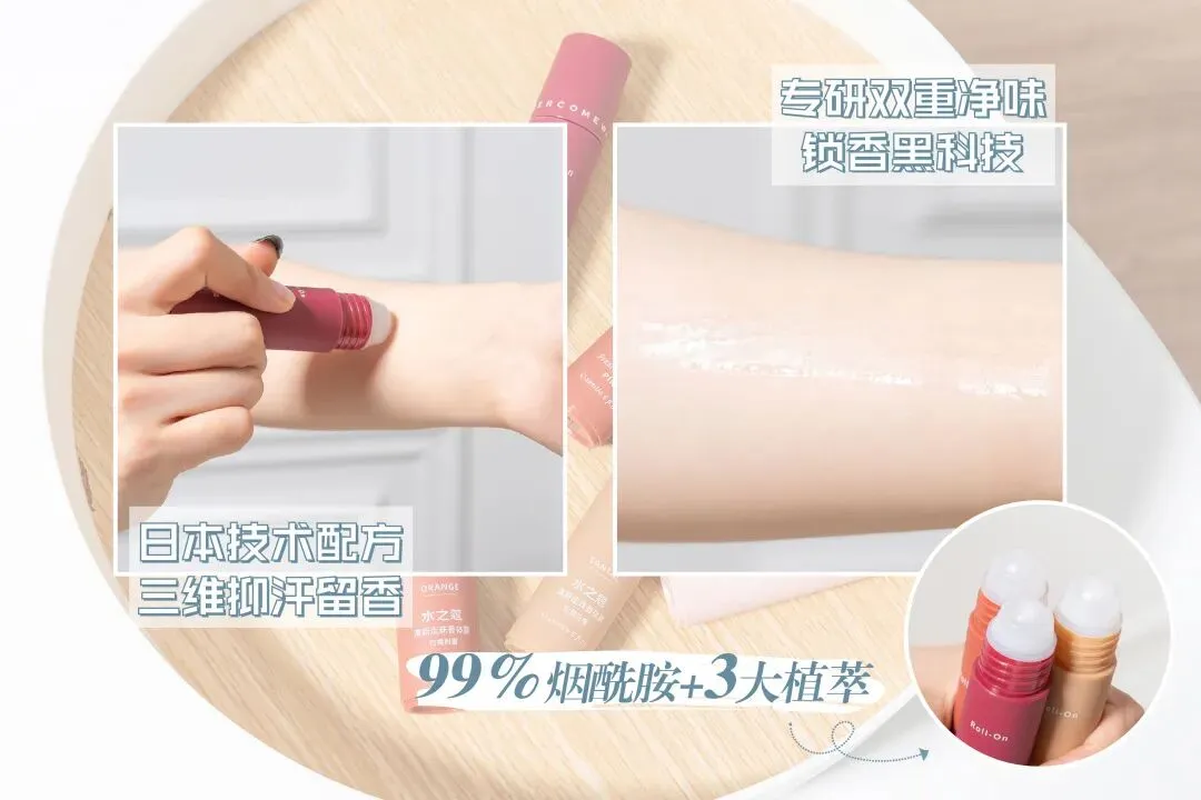它是无色透明液体质地,滚珠设计轻松涂抹,可以用在多个部位,腋下、耳后、手腕、锁骨、腿部…哪里出汗涂哪里。上身速干不留痕,味道清新高级,关键是能快速抑汗、分解异味。主要是通过氯化羟铝+小分子透明质酸钠,抑制汗液的分泌,加上双重净味锁香黑科技,消除异味。涂抹后不止清爽一整天,留香效果让你举手抬足都是香香的。