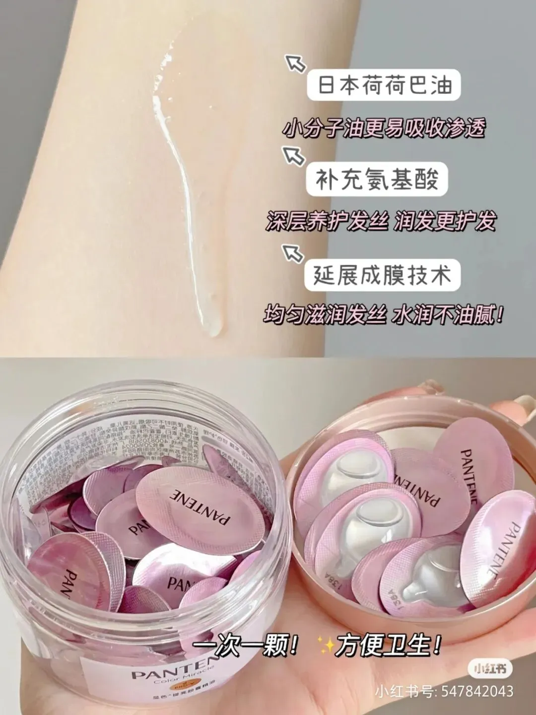头发作为氛围加成神器,时刻保持柔顺亮泽还是非常有必要滴!但出游洗发水、护发素什么的带着也太麻烦了,这时候潘婷胶囊护发精油就能派上用场了,小小一颗超方便~