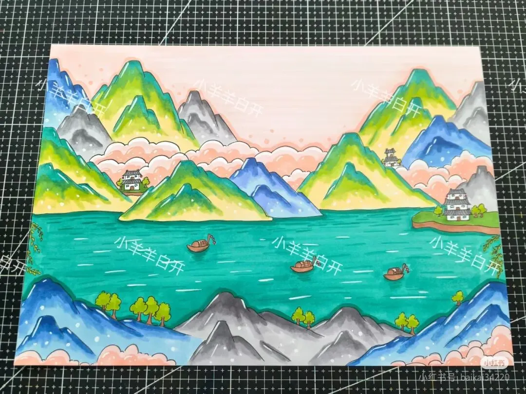 :远处是连绵的山脉,可以用蓝色或灰色调绘制。 - 天空