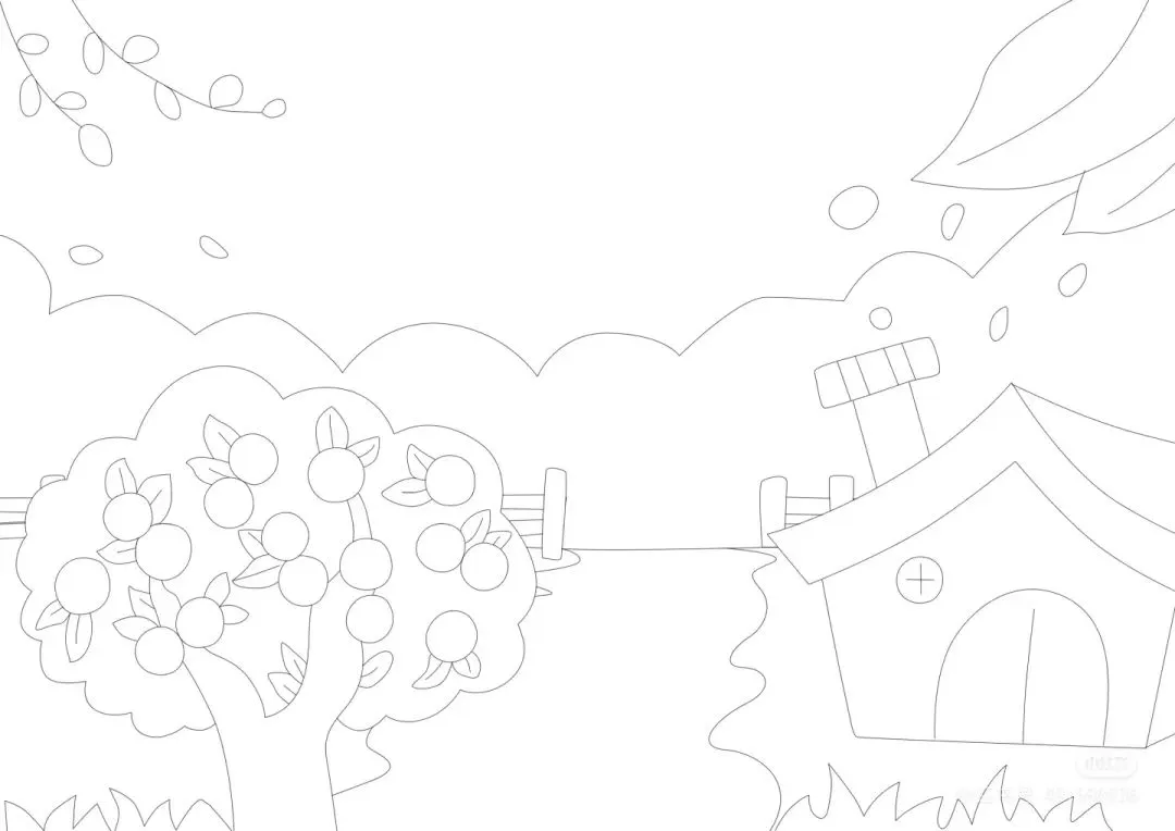 :在树下或草地上绘制盛开的花朵,如桃花、杏花,或简单的小花丛。 - 风雨