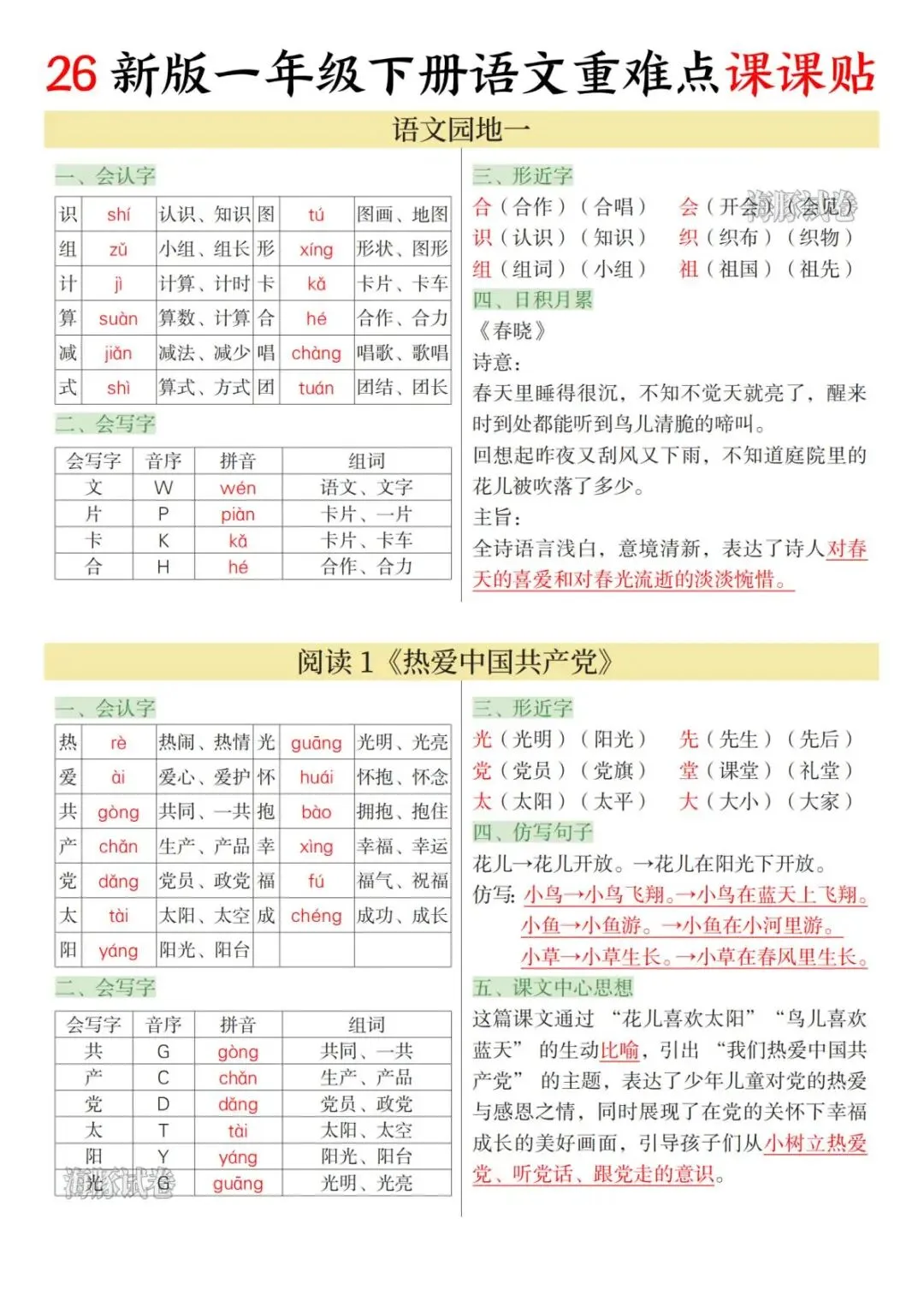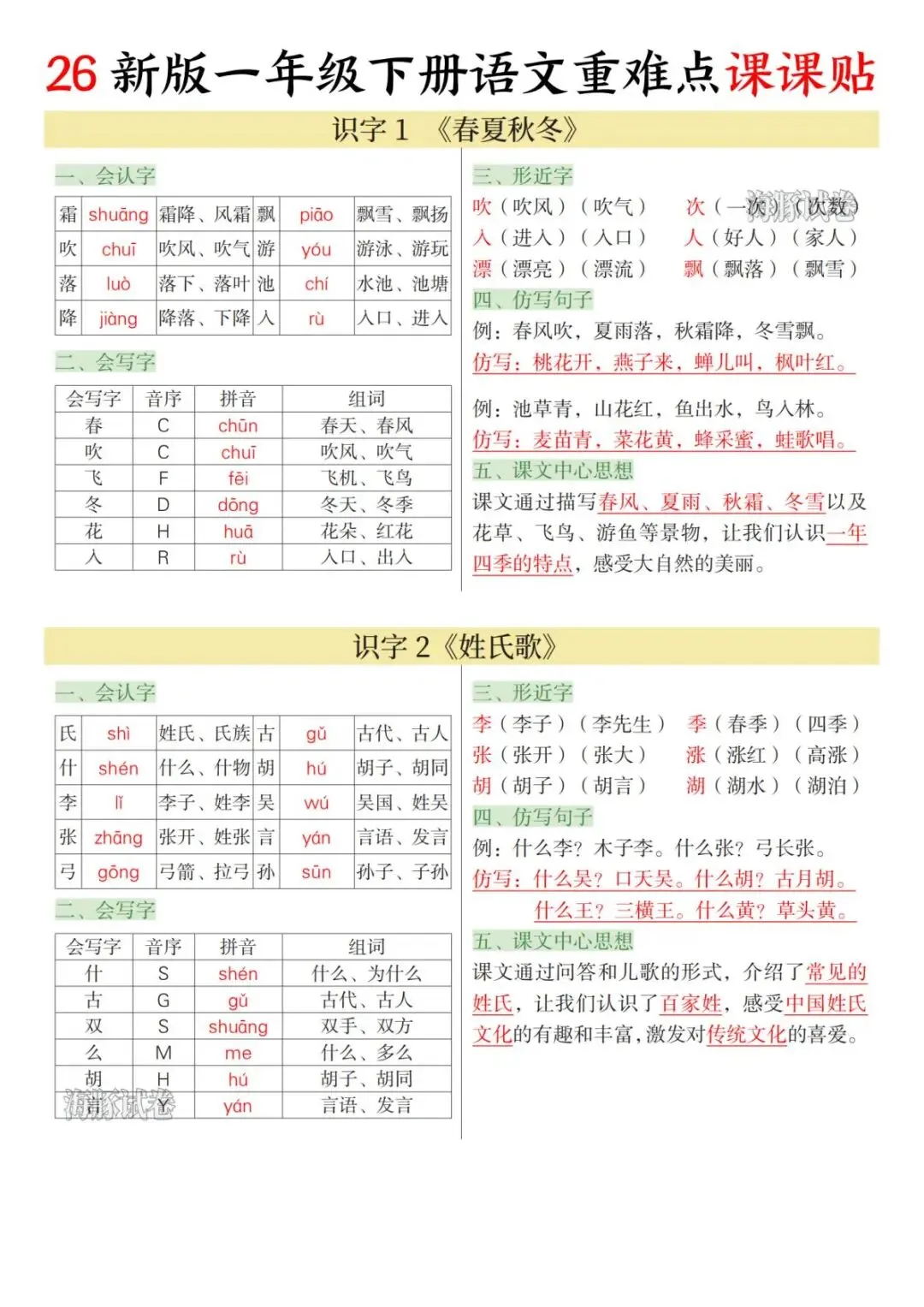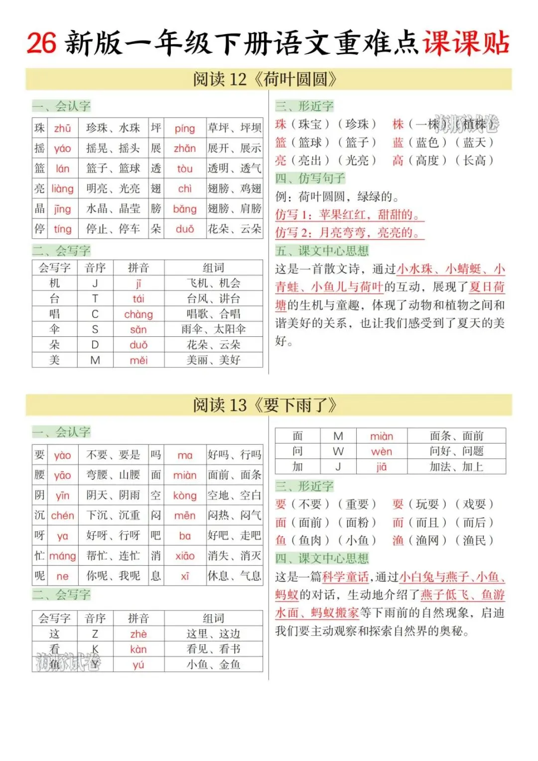 26年最新版一年级下册语文《重难点课课贴》电子版可打印