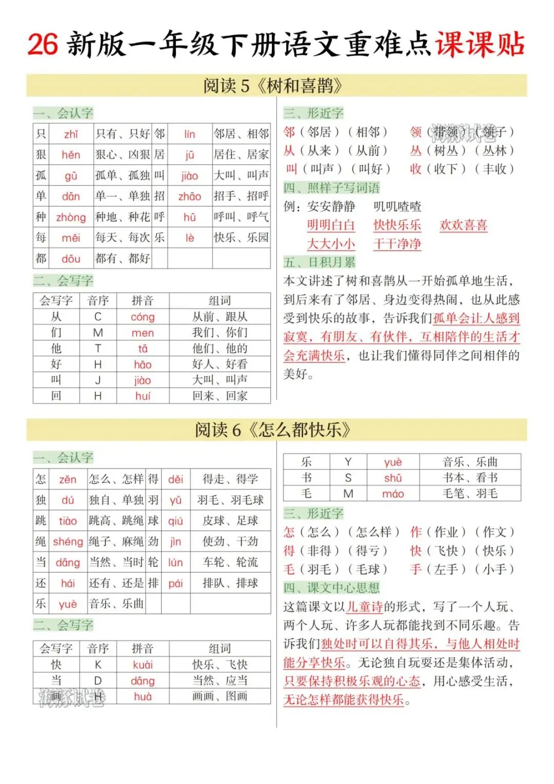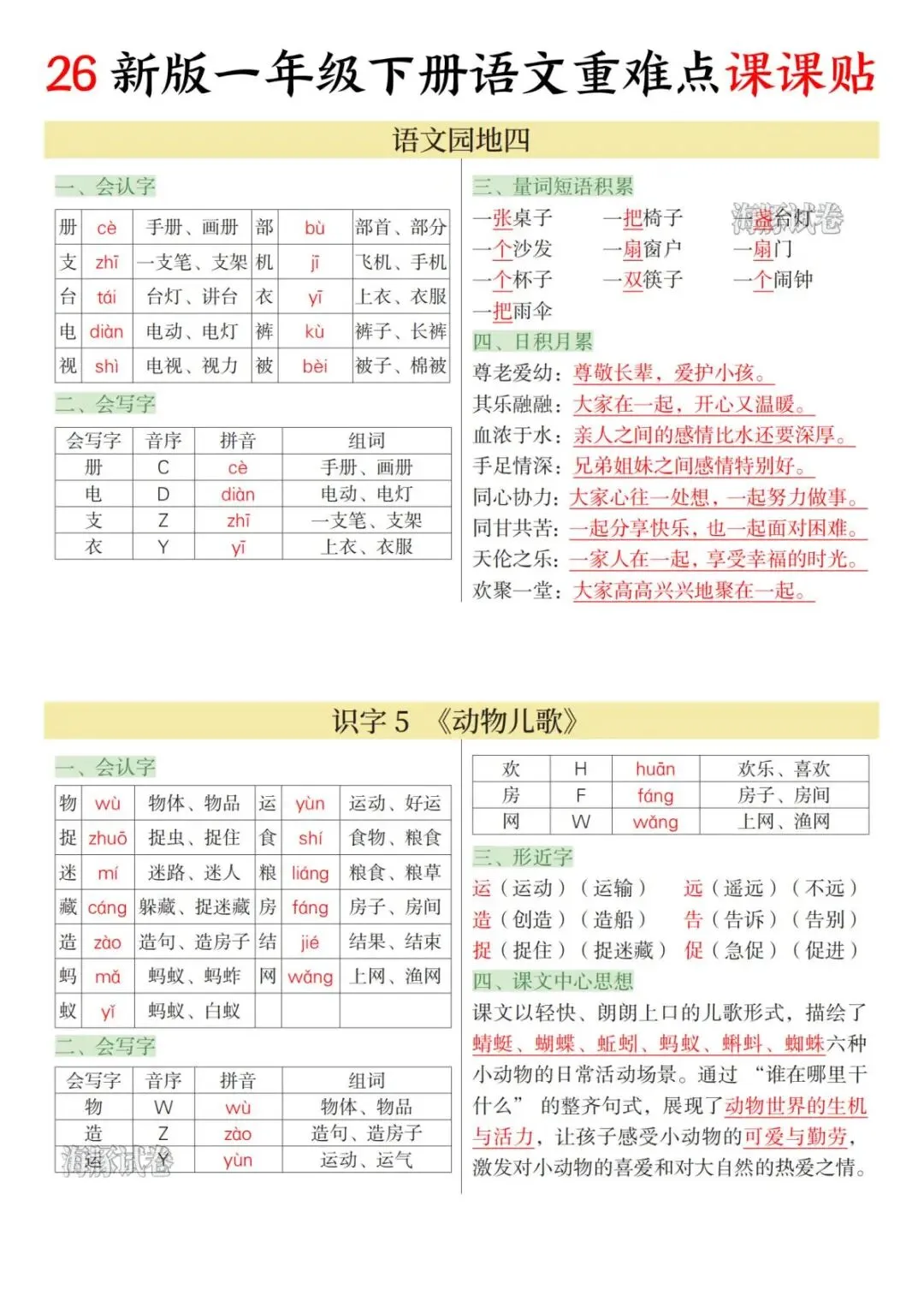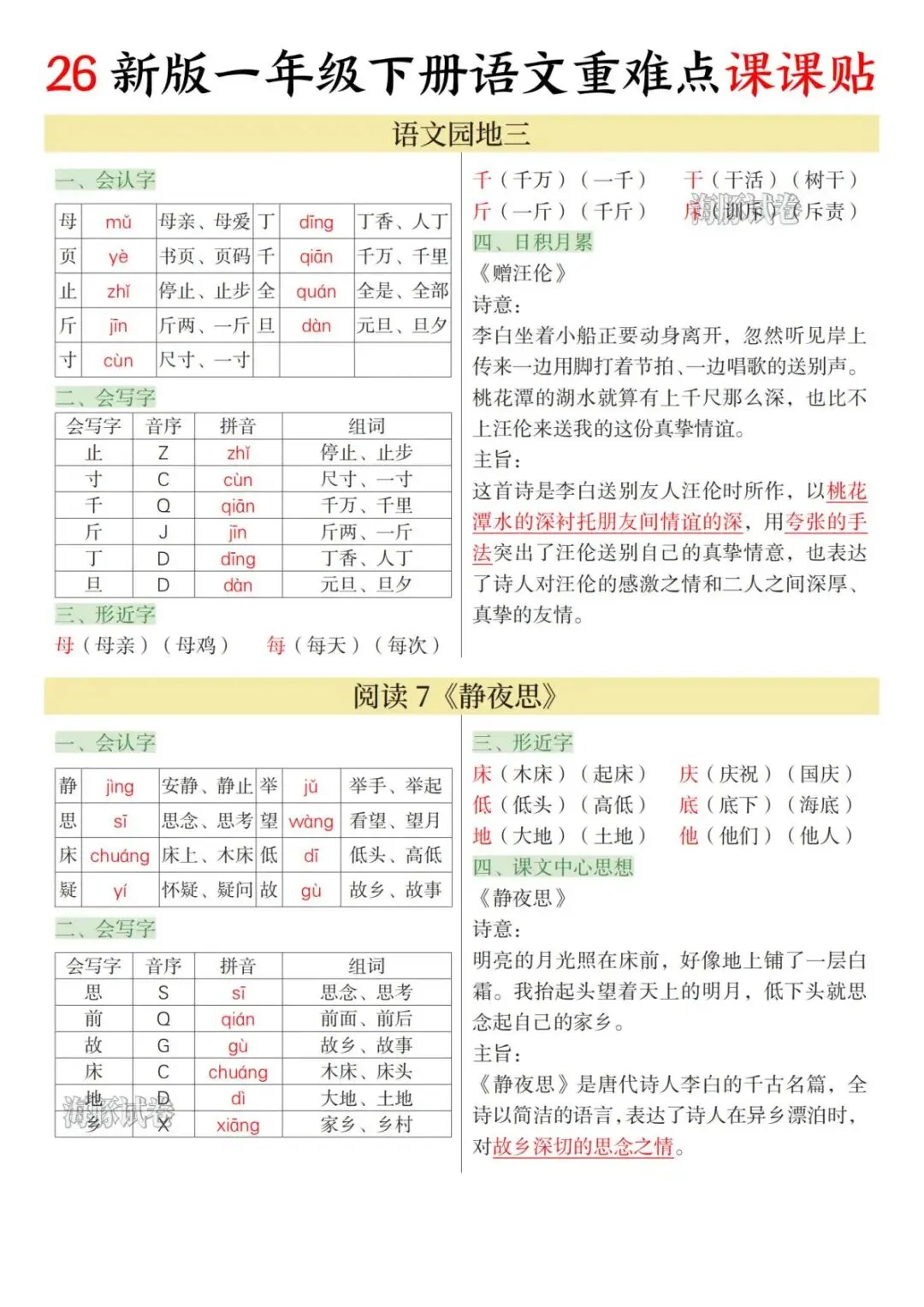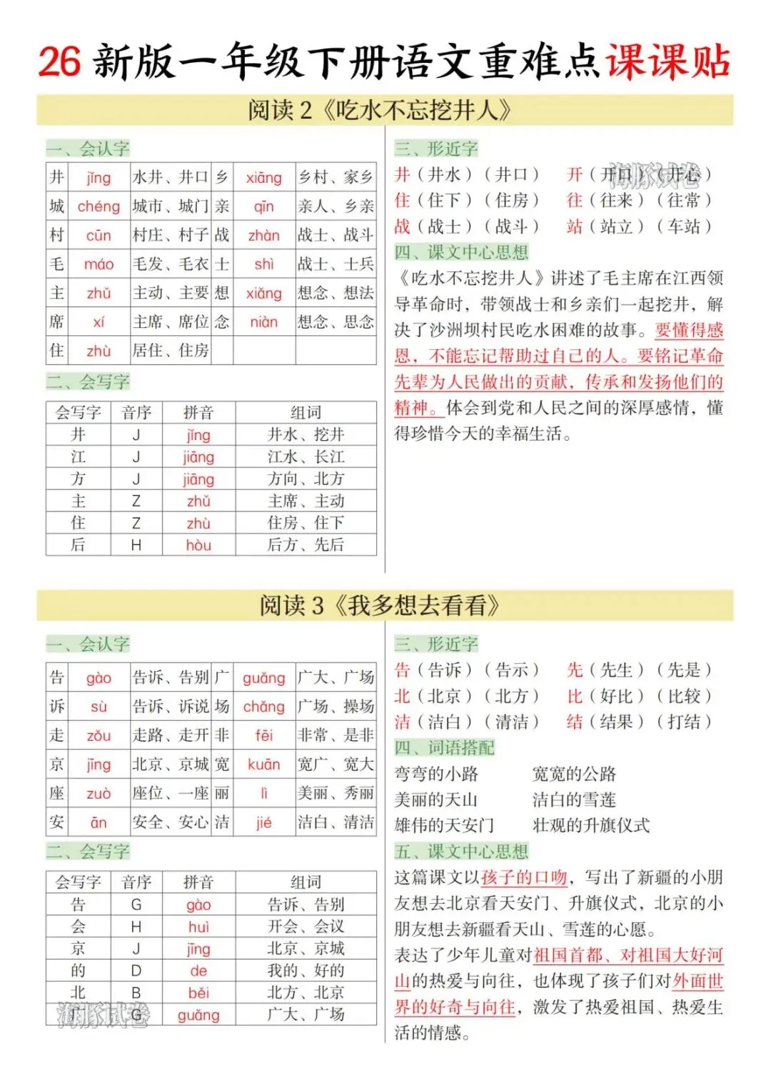 26年最新版一年级下册语文《重难点课课贴》电子版可打印