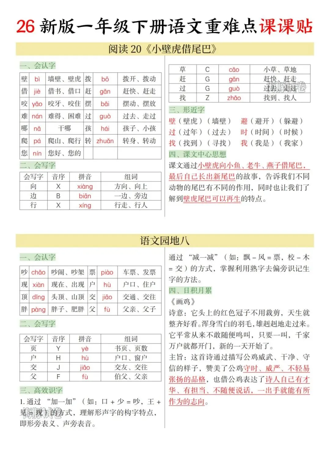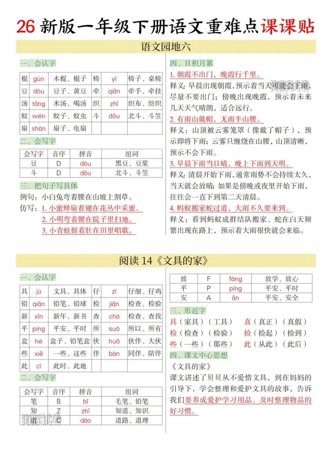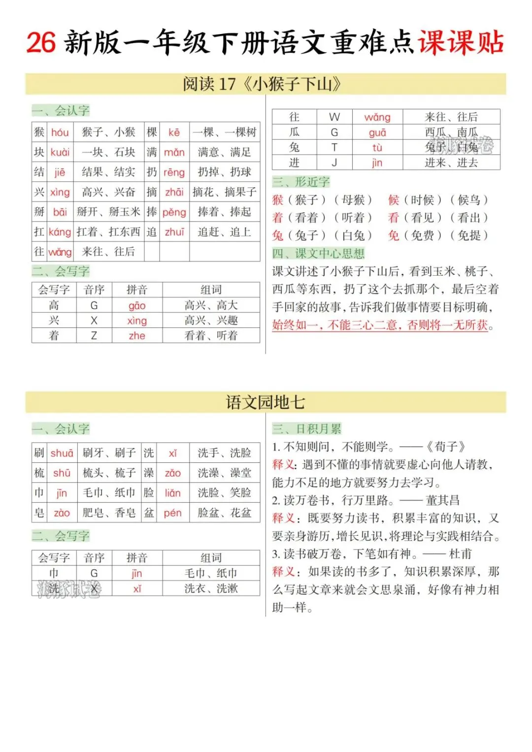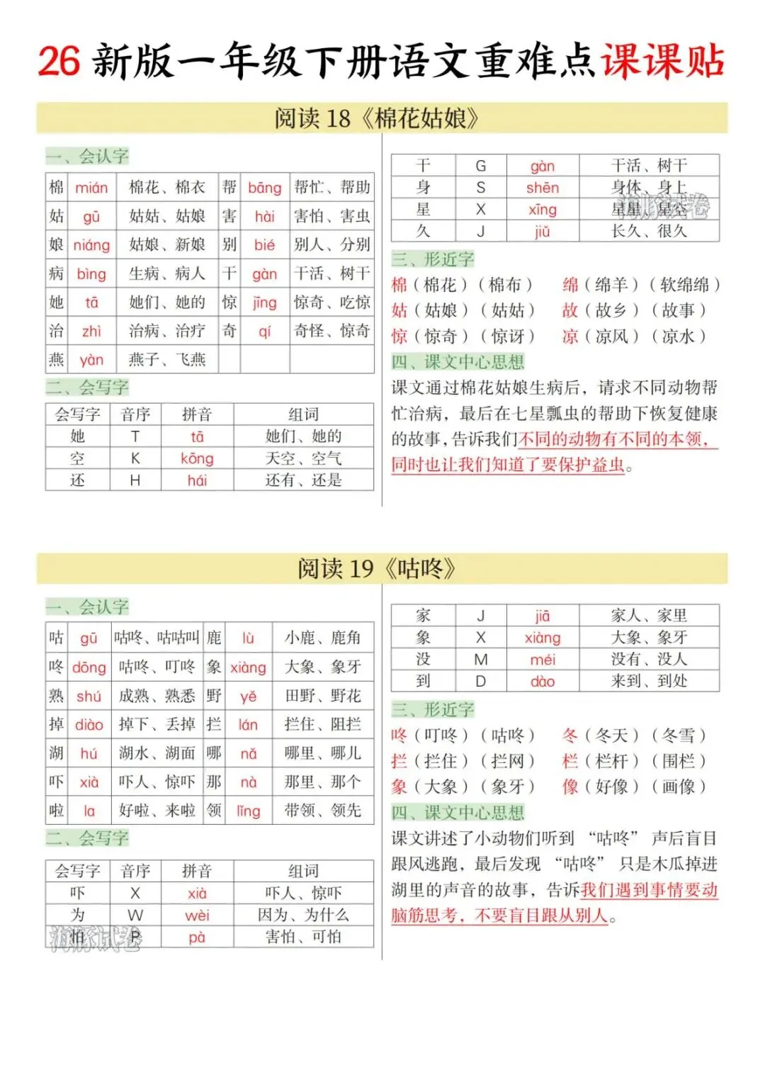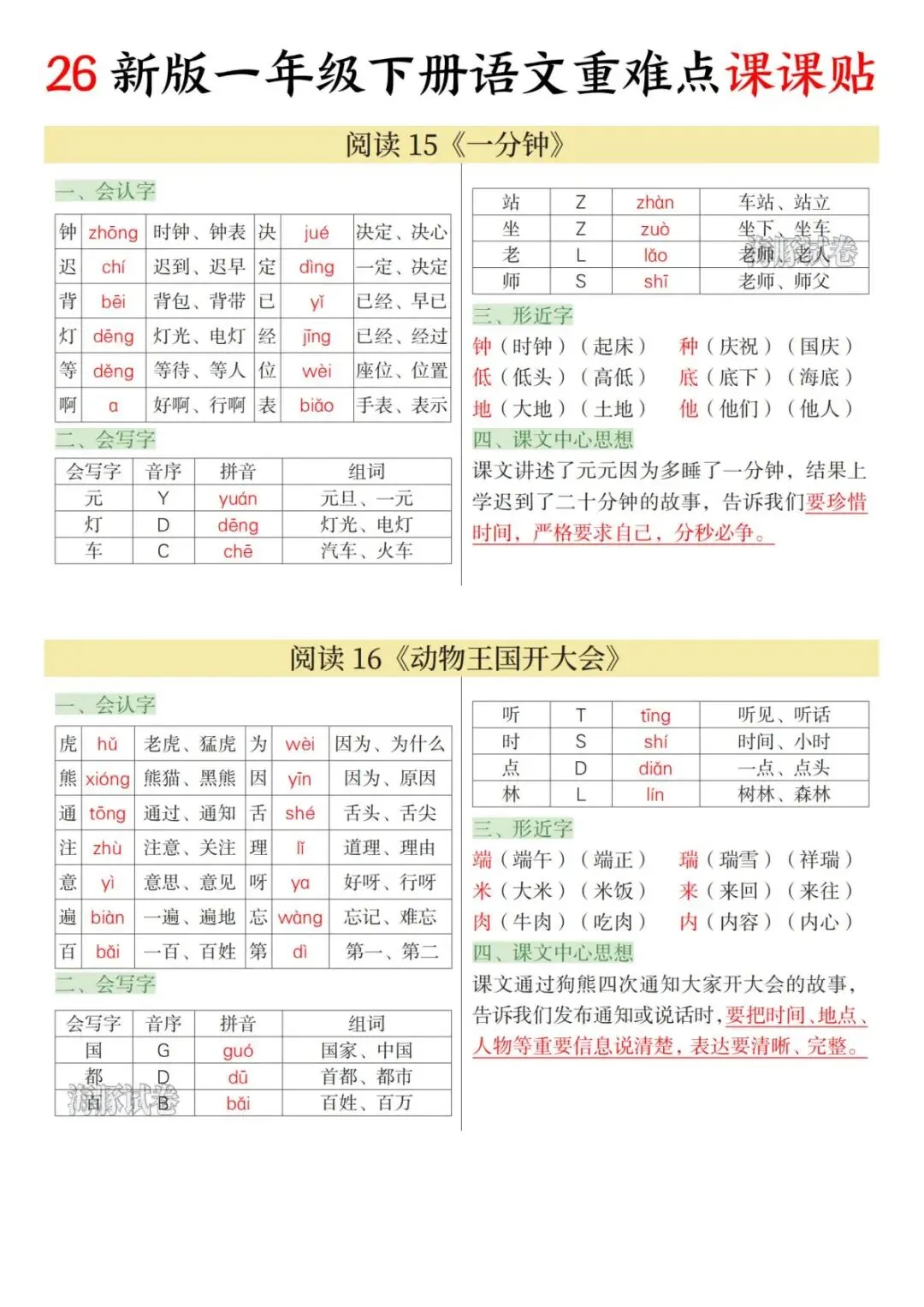 2026年最新版一年级下册语文《重难点课课贴》,共18页,高清原图电子版可下载可打印。