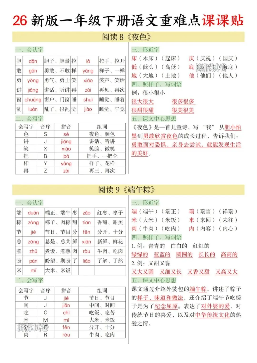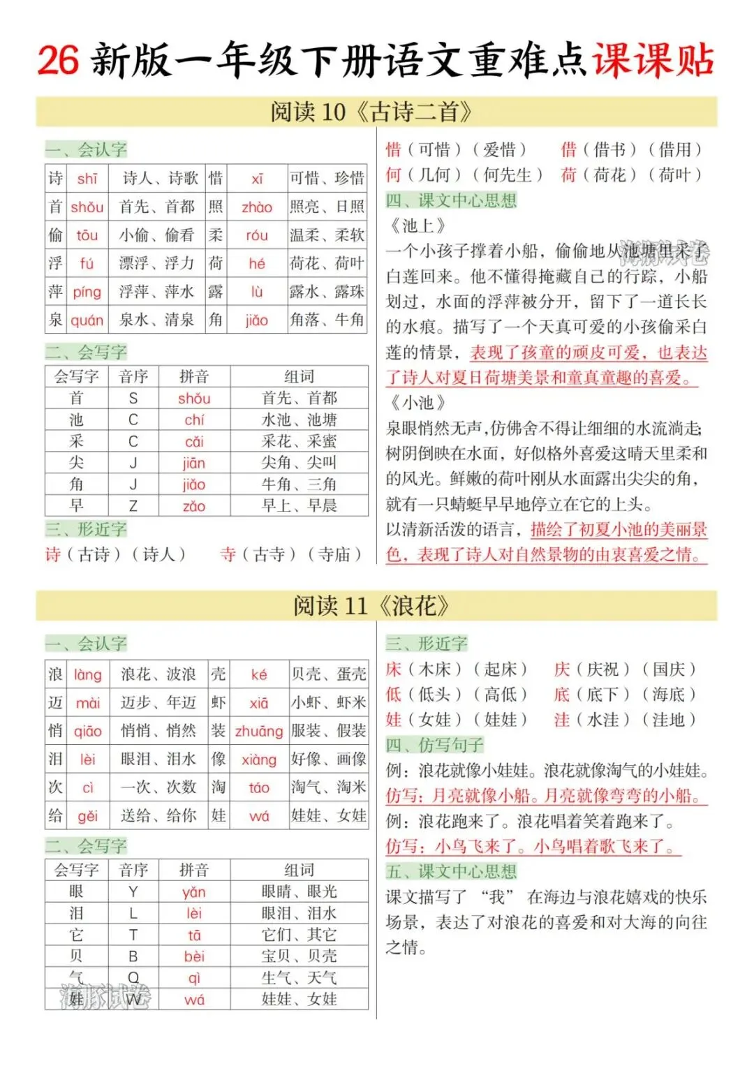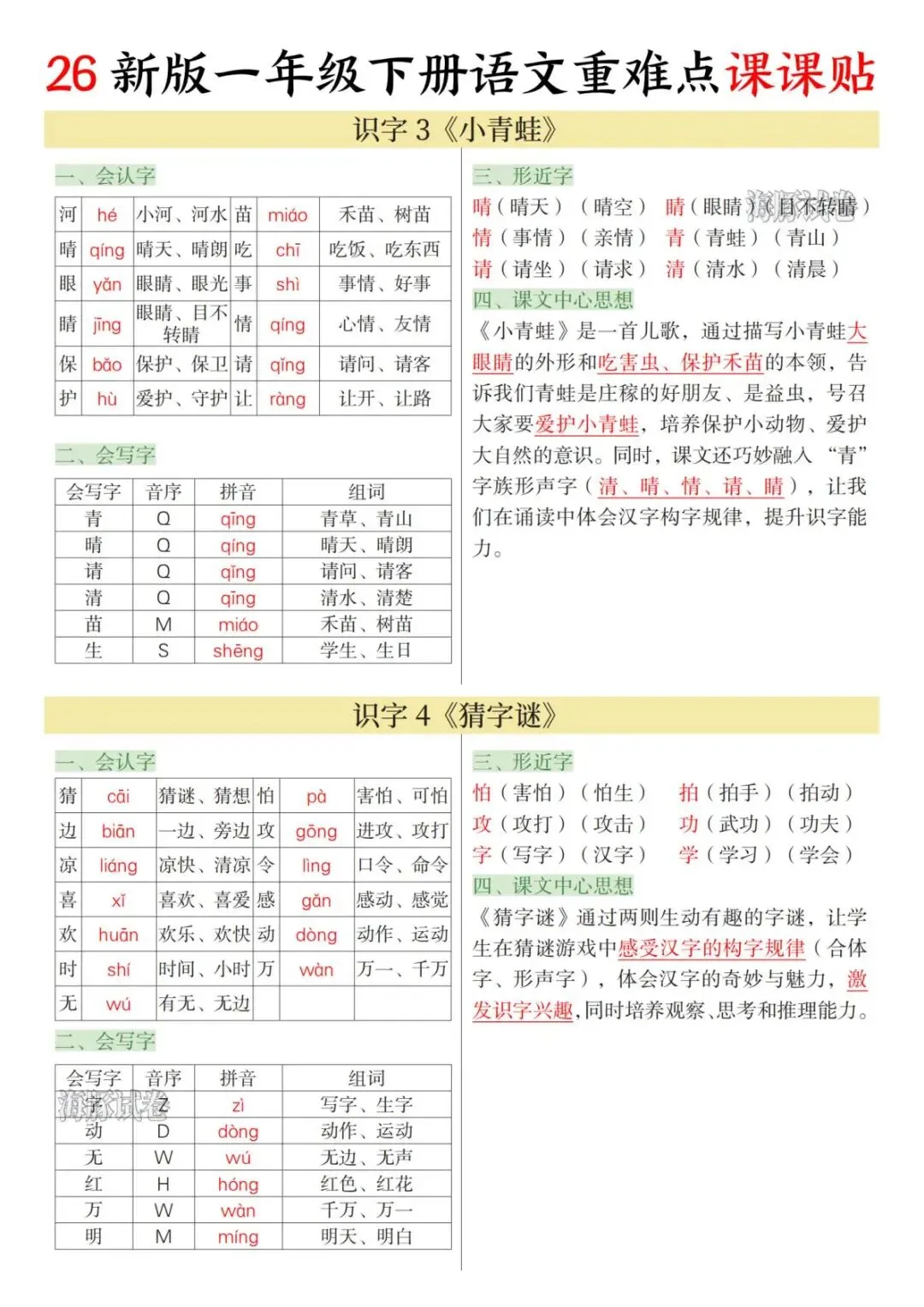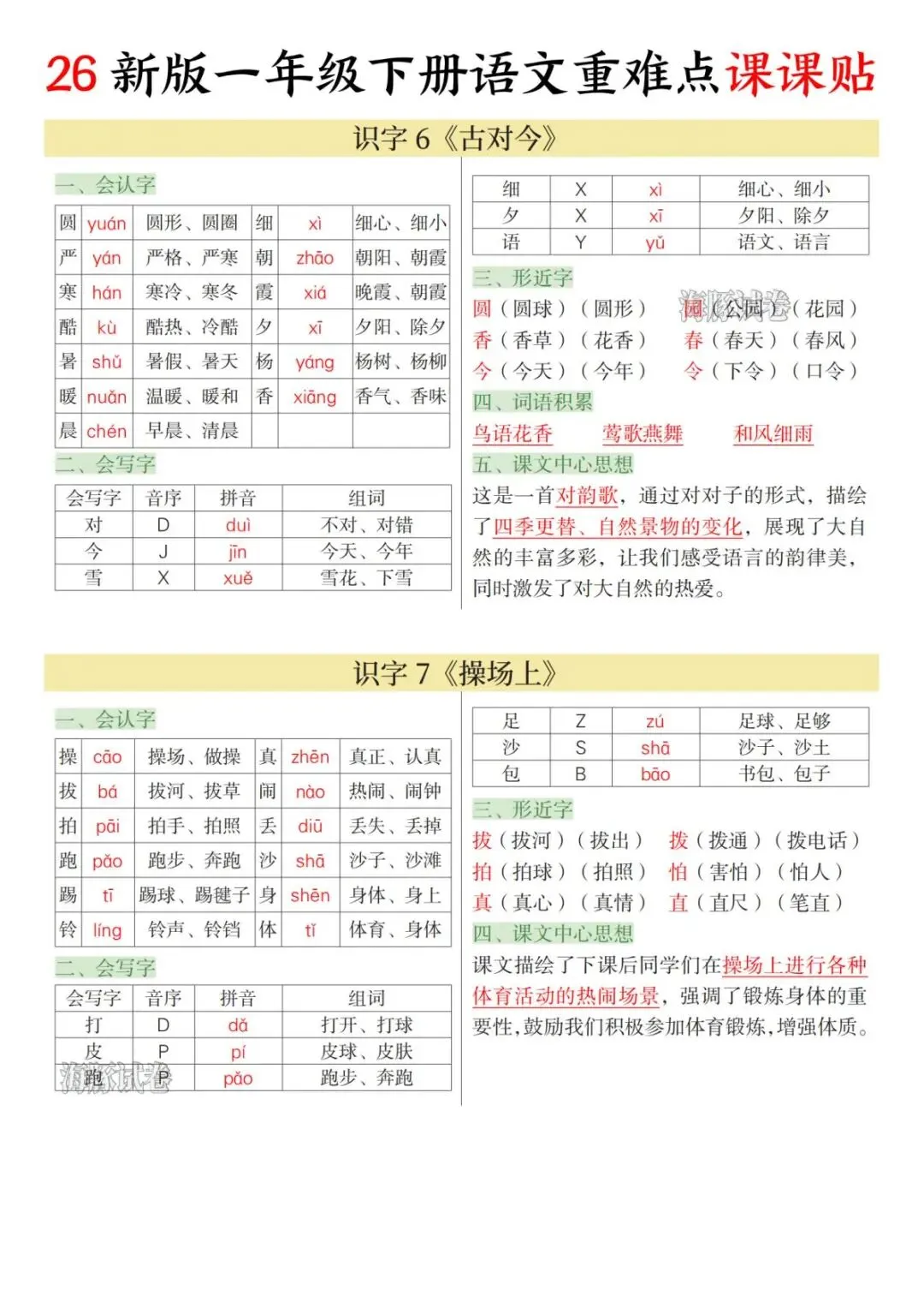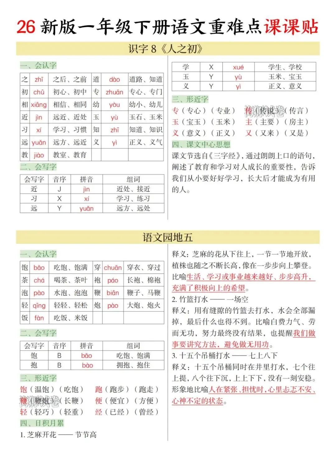 2026年最新版一年级下册语文《重难点课课贴》,共18页,高清原图电子版可下载可打印。