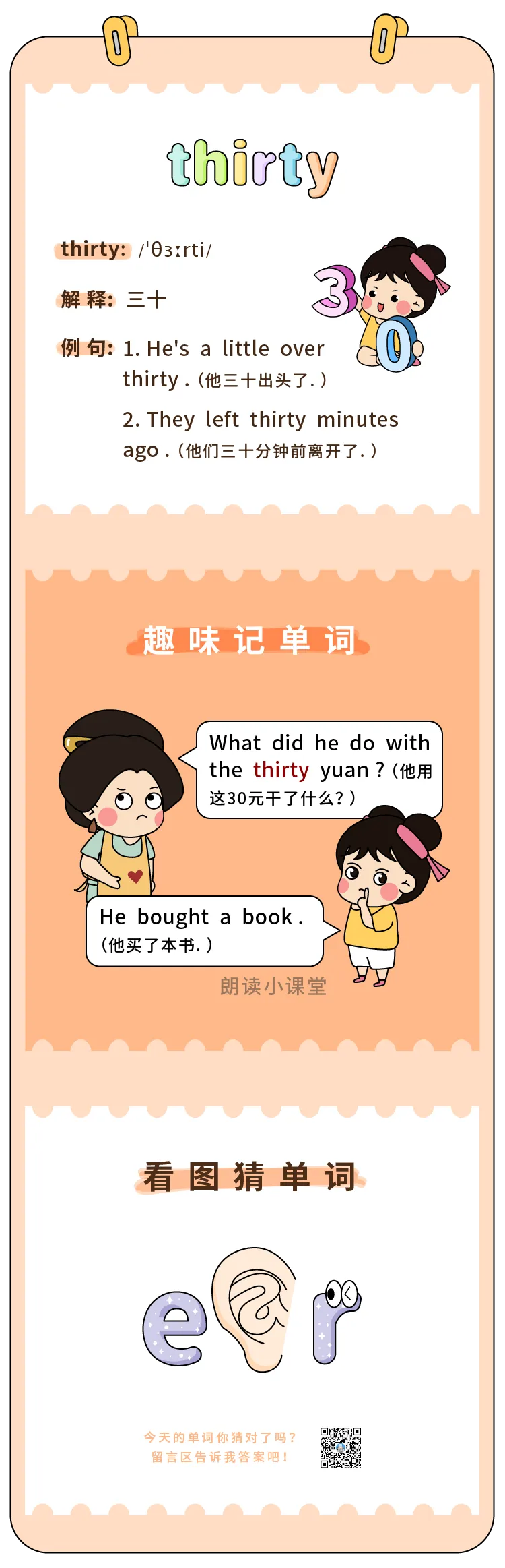 【单词漫画060】 thirty(三十) ▲点上方绿标,跟着朗读君,看漫画,学单词 作者丨朗读君 来源丨朗读君英语(id:langdujun170) 更多英语工具 点击下方卡片,学习吧! ▼ 点击下方图片 一起学习【更多单词】 ▼ 学会了在这里集合~