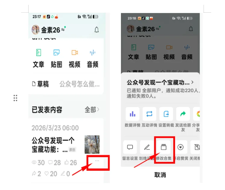 点击文章右上角“…”或【更多设置】→【合集】。