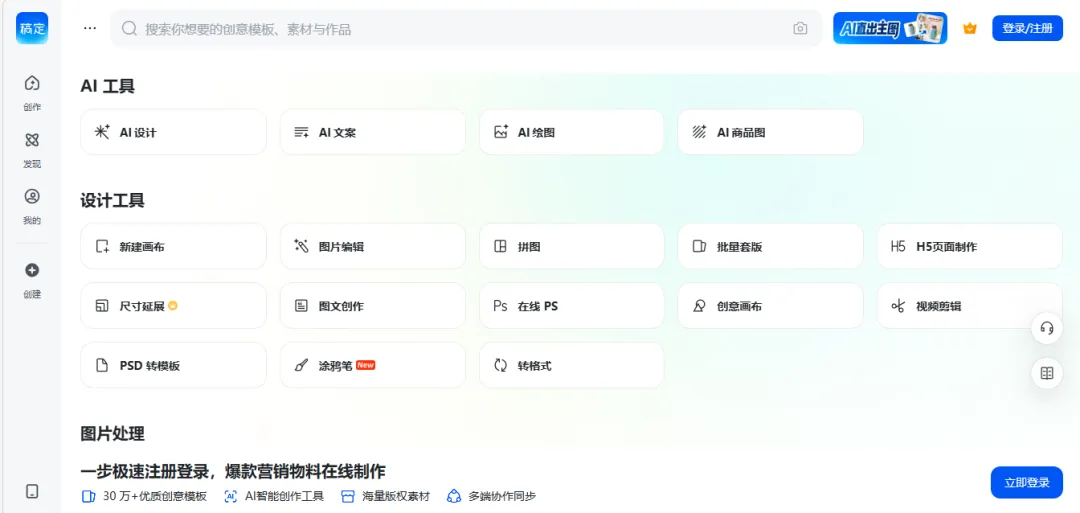 - 选择AI工具:登录后,进入稿定AI的主界面。选择AI工具,点击进入。