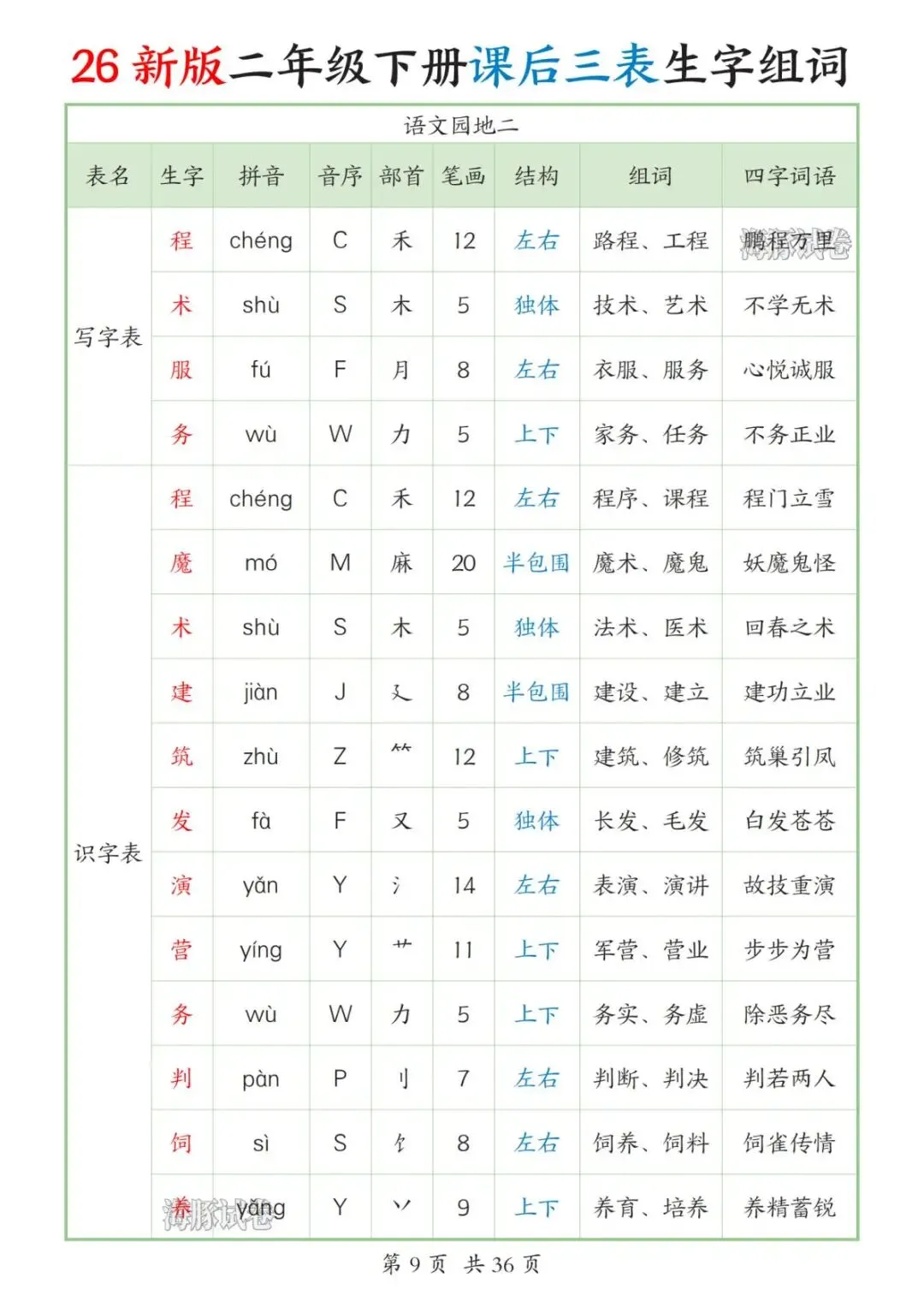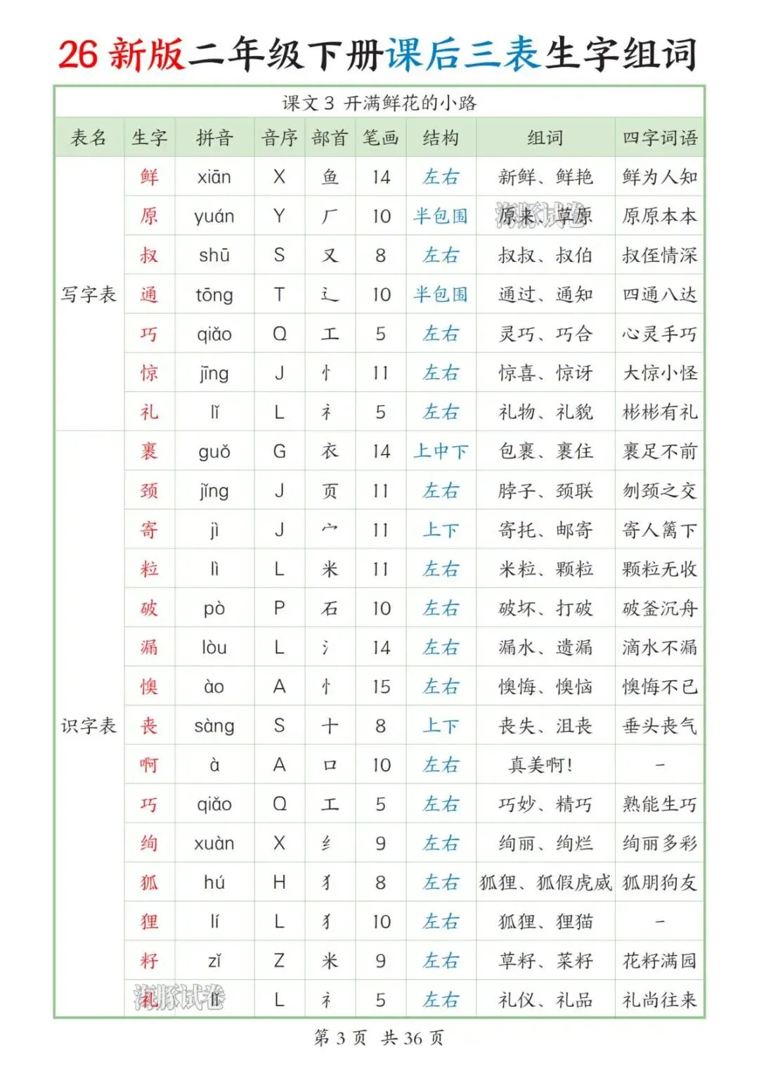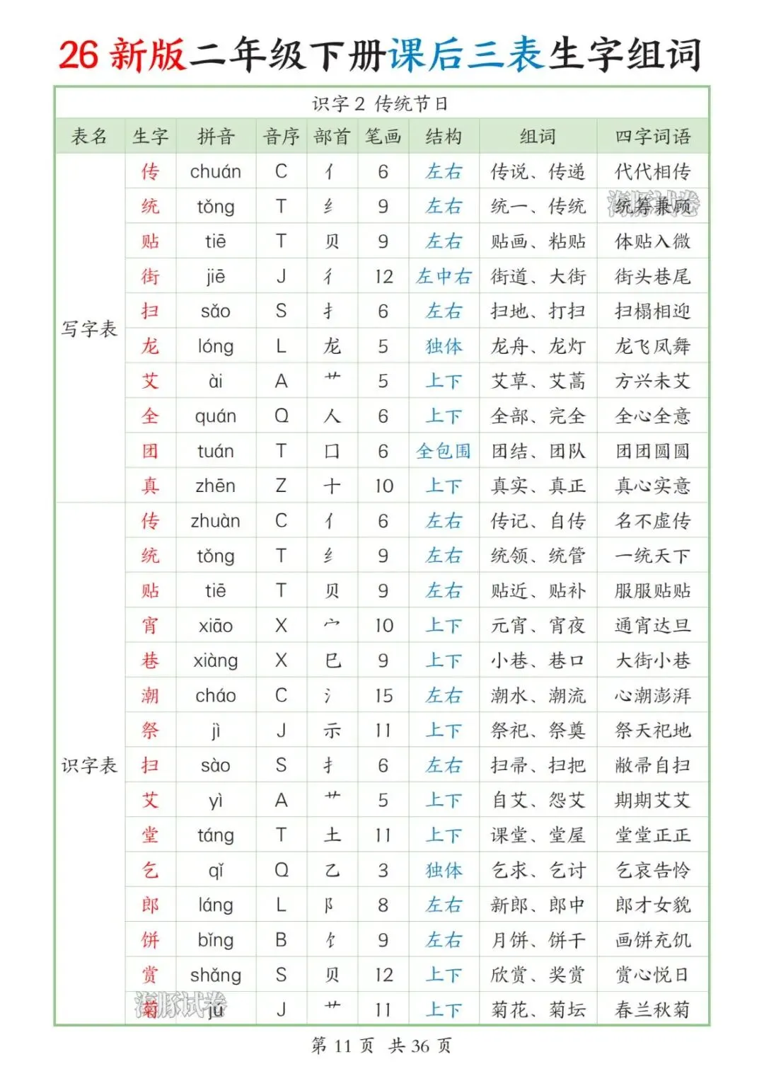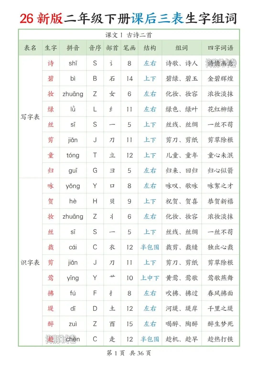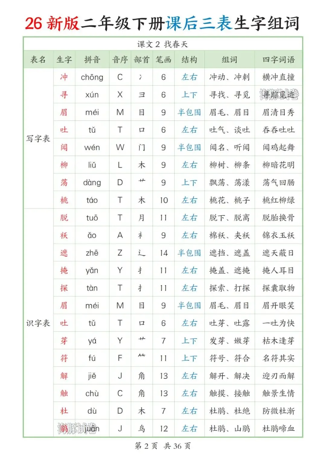 2026年春同步教材最新版二年级下册语文《课后三表生字组词(拼音音序+部首笔画+结构组词)》,共36页,高清原图电子版可下载可打印。
