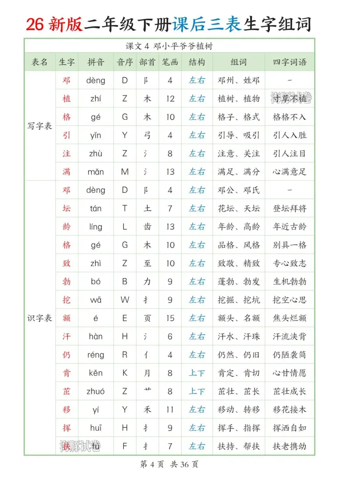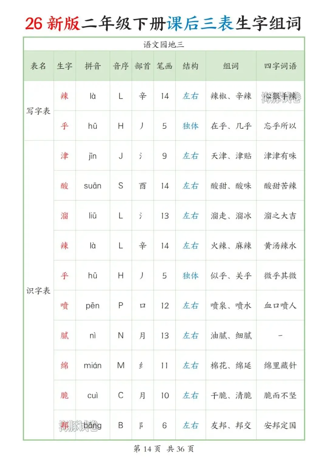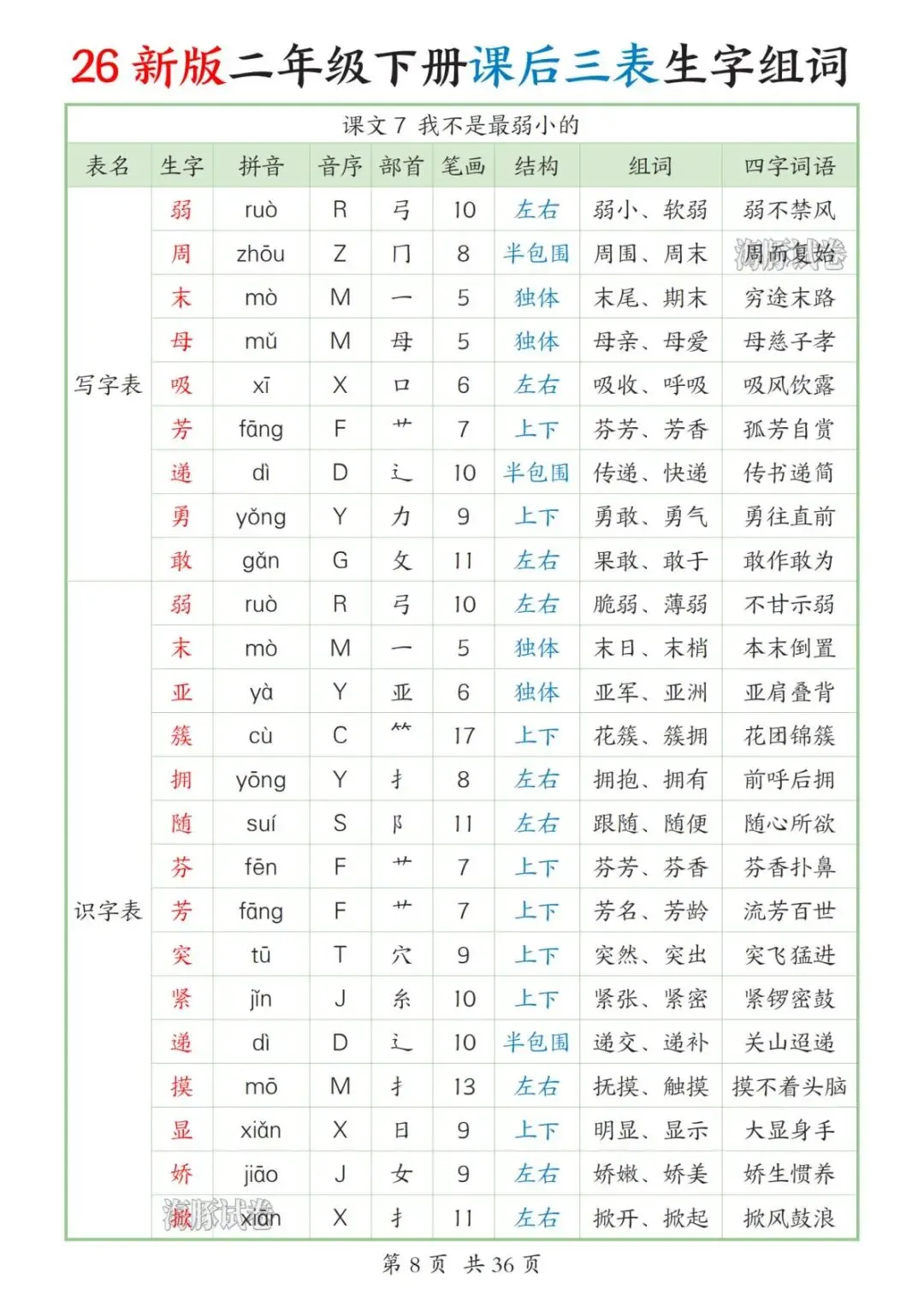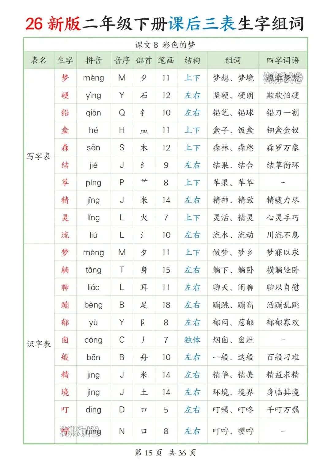 2026年春同步教材最新版二年级下册语文《课后三表生字组词(拼音音序+部首笔画+结构组词)》,共36页,高清原图电子版可下载可打印。