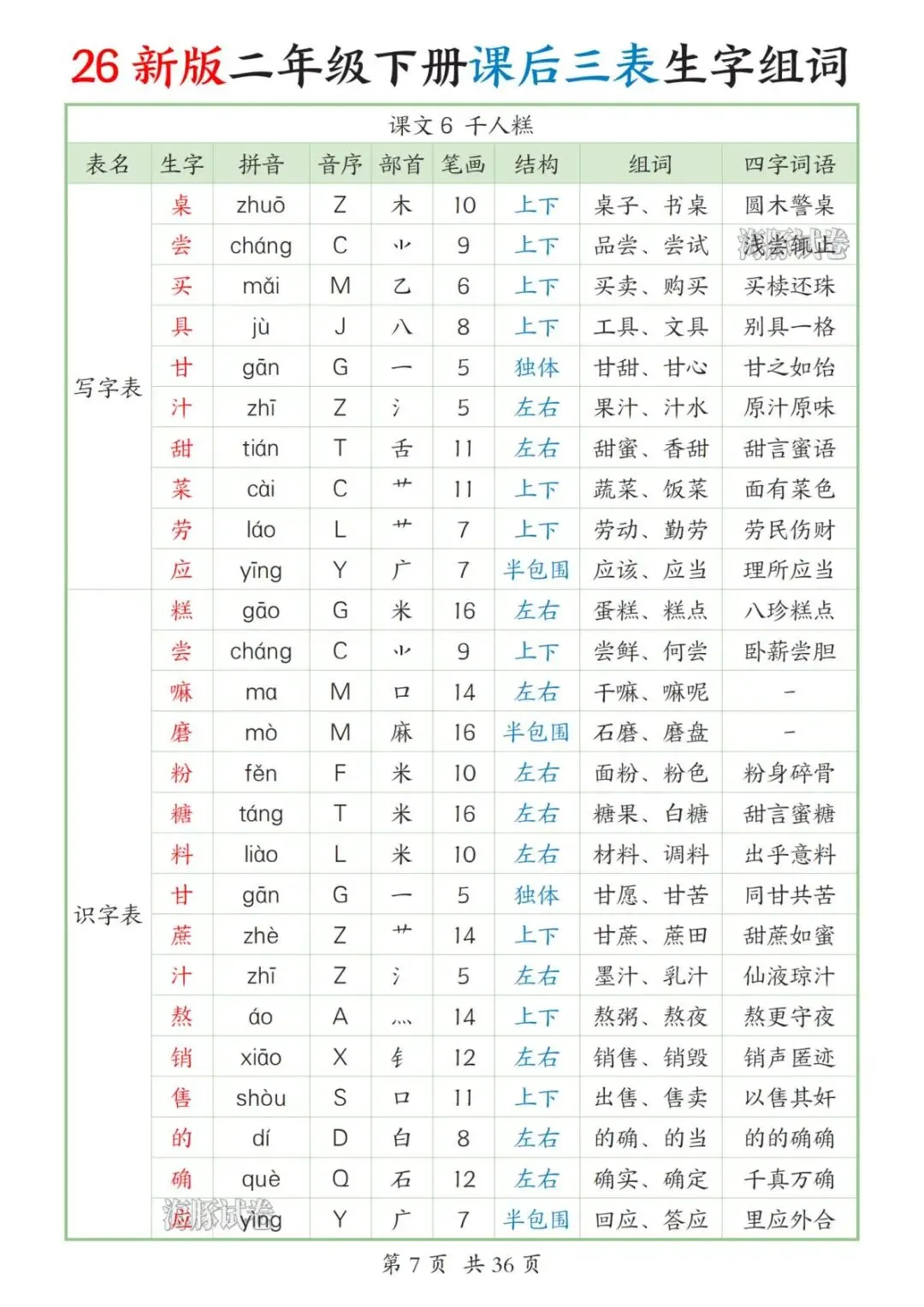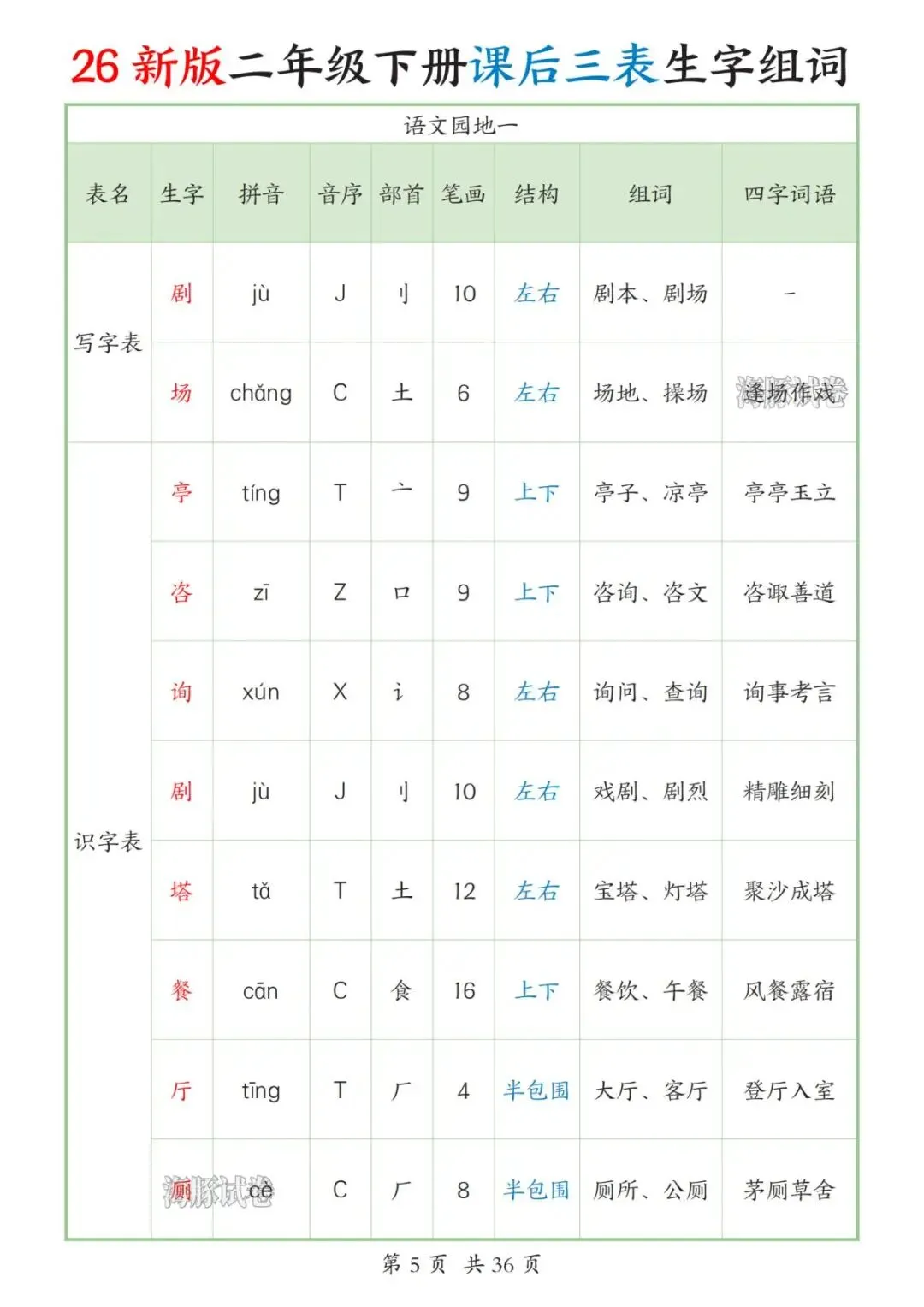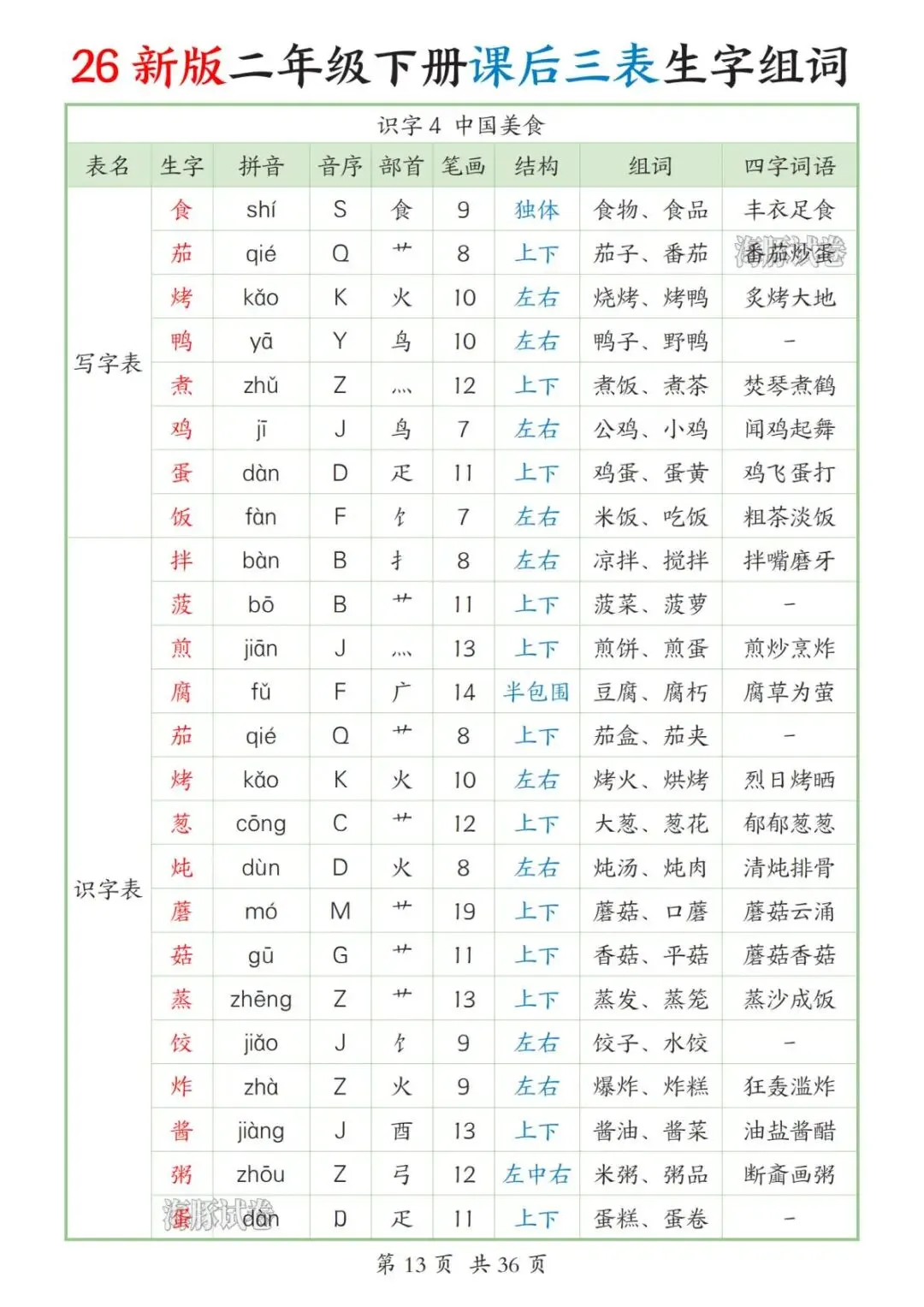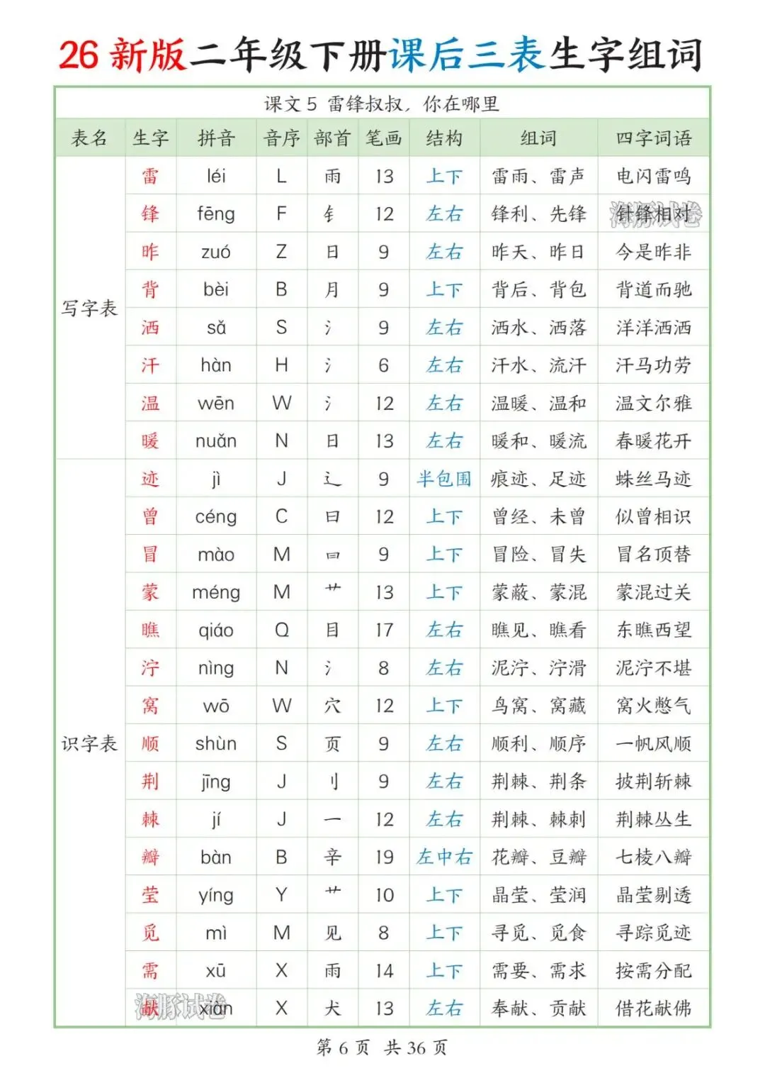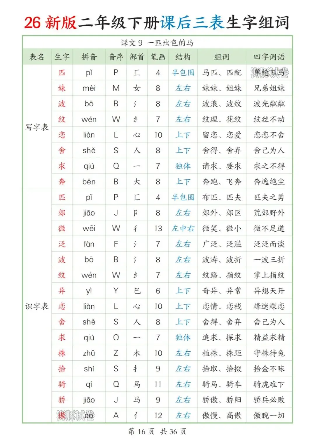 2026年春同步教材最新版二年级下册语文《课后三表生字组词(拼音音序+部首笔画+结构组词)》,共36页,高清原图电子版可下载可打印。